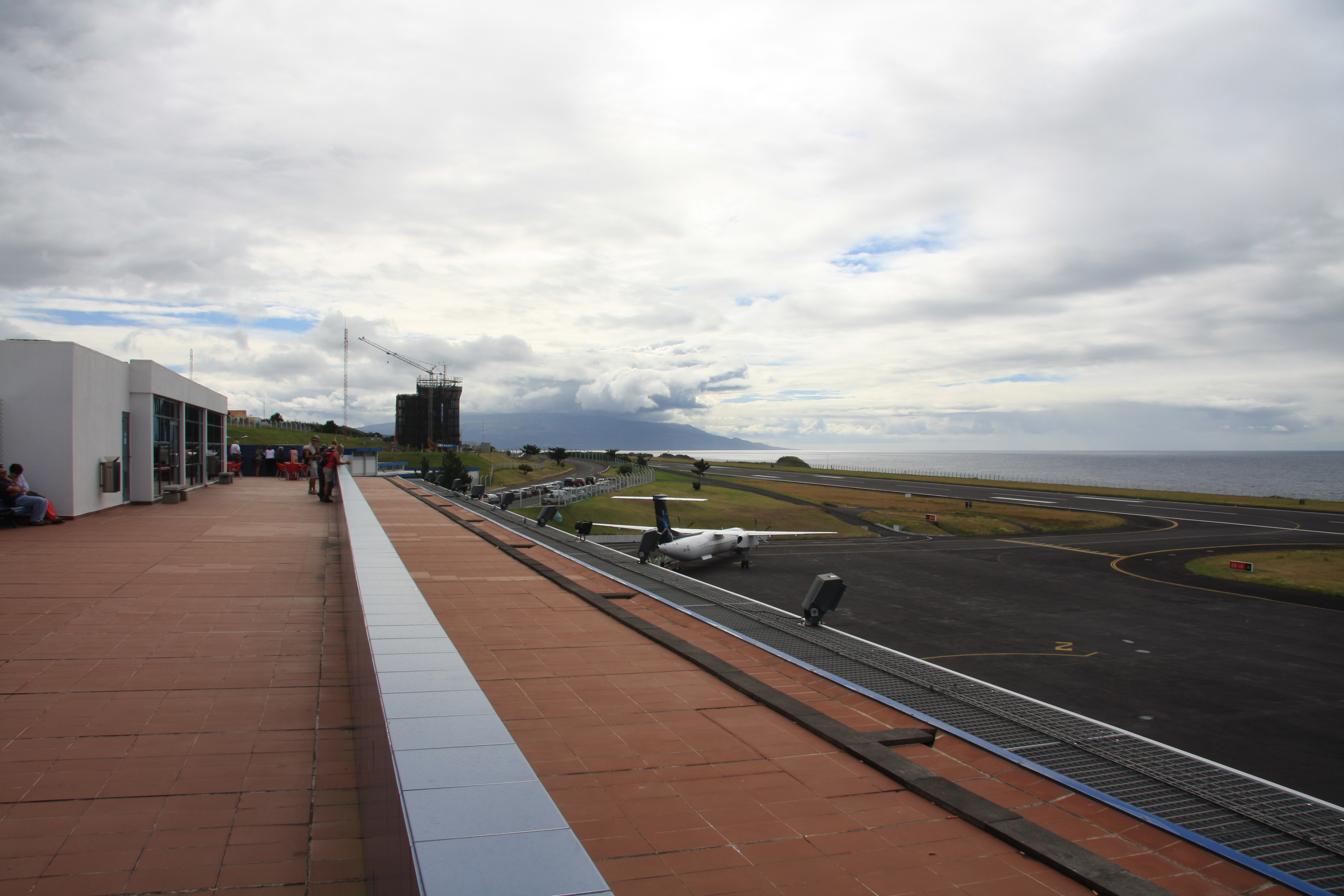 Scene atop the main terminal building, showing the runway, flight and mountain of Pico in the distance |