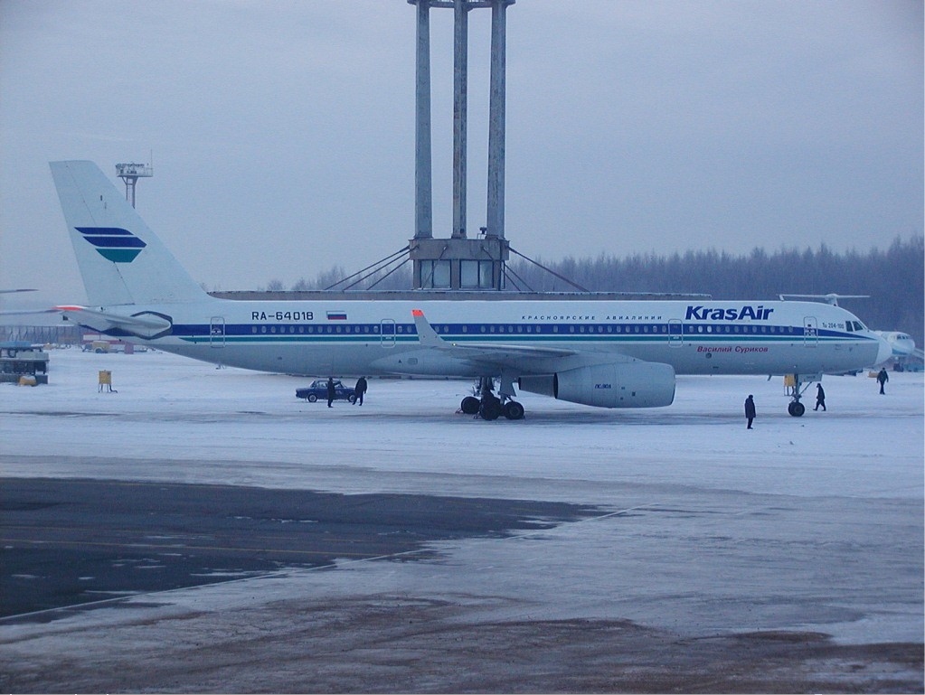 A Kras Air Tu-204 on stand at Pulkovo in winter |