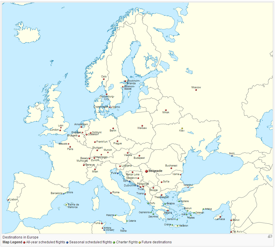 Belgrade Nikola Tesla Airport (Serbian: Аеродром Београд – Никола Тесла / Aerodrom Beograd – Nikola Tesla) (IATA:BEG, ICAO: LYBE) is the primary international airport serving Belgrade, Serbia. Previously known as Belgrade International Airport, it was renamed in 2006 in honour of Serbian scientist and inventor Nikola Tesla. This is the busiest airport in former Yugoslavia. The airport is situated 12 km (7.5 mi) west, of central Belgrade, in the Surčin Municipality, surrounded by Syrmia’s fertile lowlands. Passengers on the right hand side of planes descending from the east have a view of downtown Belgrade, especially the districts ofČukarica and Novi Beograd. In 2008 the airport installed ILS CAT IIIb equipment to allow aircraft to land and depart in the heaviest of fog, which in past years led to numerous flight diversions mostly in late December and early January. The national flag carrier and largest airline of Serbia, Air Serbia (former Jat Airways), uses Belgrade Nikola Tesla as their hub, it is also one of the operating bases for low cost airline Wizz Air. Charter airline Aviogenex along with the air taxi services Air Pink, Jat Airways AVIO taxi and Prince Aviation also call the airport their home. The airport is owned and operated by the Public enterprise “Aerodrom Nikola Tesla Beograd”. The airport recorded a net profit of €21.5 million at the end of 2010. As of March 2014, Belgrade Nikola Tesla Airport is the fastest growing major airport in Europe.