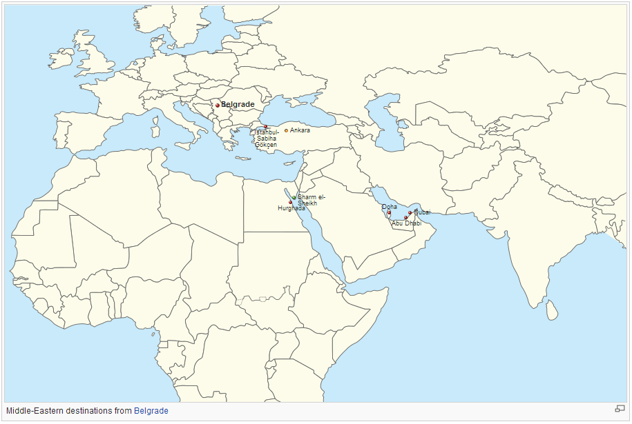 ^1 Qatar Airways’ flights between Doha and Belgrade are operated with a technical stop in Ankara, Turkey. However, Qatar Airways does not have fifth freedom traffic rights between Belgrade and Ankara. Destinations MapThe map includes destinations in Europe and parts of North Africa and Middle East served from Belgrade Airport. CargoThe following cargo airlines serving the airport on a regular basis as of July 2014: