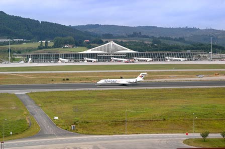 The Airport can be found just 12 kms outside the City of Bilbao and in the last 10 years the passenger traffic has more than doubled from 1.6 million passengers in 1995 to just under 3.4 million passengers in 2004. In Spanish it is known as Aeropuerto de Bilbao. The baggage area at Bilbao Airport is in a bright room on the ground floor of the terminal. After collecting your luggage head for the main Bilbao Airport arrivals hall where you will find directions for the buses and taxis. You will also find a selection of Car Hire companies and tourist information offices within the hall. On the top floor of the terminal you will find the Bilbao Airport departures hall which has 36 check in desks and is accessed by crossing a five lane (38m) bridge. After checking in the departures lounge has a Duty Free shop and a couple of other gift shops and cafes. Leave plenty of time for the walk to your aircraft as you will pass along a 300m glass sided corrider that gives you a fantastic view of the entire airport terminal. Iberia have a VIP lounge on the 1st Floor of the departure hall and you can call them on 0034 944 869 836. Spanair also have a VIP lounge but on the second floor, 0034 944 869 777. The Bilbao Airport buses start the service into the City Center at 0615 each morning and run every 30 minutes until midnight. The fares for the 15 minute journey are €1.15. Bilbao Airport taxis can be found outside the main arrivals hall and the fare for the journey into Bilbao City center is around €20. History The construction works commenced during the Civil War but during this time and until June 1937 the airport was only used as a base for military activities. In 1938, the second stage of the airport's development began. The council resumed procedures with the government to modify the primitive project of 1936 and the drafting of a new project was authorised and later approved by the General Management of Infrastructure. The airport opens to traffic In 1940, it was decided by common agreement with the local organisations affected to build a civilian airport in Sondika. The construction works progressed slowly and on the 19th September 1948, the airport was at last opened to daytime traffic with the establishment of an air path to Madrid by Aviación y Comercio, SA. Two years later, the terminal, named Carlos Haya after the well-known pilot from Bilbao, began to give service. At this time, the airport had an asphalt runway, the 11-29 (measuring 1,440 by 45 metres), another earth runway (measuring 1,500 by 150 metres), a taxiway, a passenger terminal, a tower control, a radio beacon, a direction finder as well as police, post office, weather, health, fuel and telephone services. In 1955, a taxiway was built to link the runway with the parking stands and terminal. An apron measuring 124 by 60 metres, a hangar for the Royal Flying Club of Vizcaya and permanent facilities for Campsa were also built. Between 1964 and 1965, an instrumental ILS landing system and a meteorological radio for storm detection were installed; the runway was extended to 2,000 metres and the apron to 12,000 square metres. In 1975, the runway was surfaced and its orientation became 10-28 due to the change in magnetic declination. In 1977, the parking stand was extended, a link road was built and an ILS system was installed. The runway 12-30, measuring 2,600 metres long, was opened the same year and the airport was classified as first category the following year. During the eighties, the ILS landing system entered into service for runway 10/30; the communication centre, passenger terminal and parking facilities were enlarged; and a fire service building and cargo terminal were constructed. In 1996, a new taxiway with two rapid exits and a new