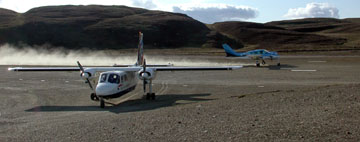 Ground falls away very steeply approx 30m from each runway end. Runway surface may be slippery when wet. A landing on 06 can be somewhat disconcerting to those new to the 'field as the approach is over ground sloping down to the threshold of 06 which lies in something of a 'hole' - the centre of the 'strip being about six feet higher than either end! With a light to moderate wind blowing along the strip be prepared for a loss of air-speed just short of the 24 threshold as the wind drops into the valley. In stronger winds the airflow is more turbulent and the effect is less noticeable. Bird activity can be a problem at times, especially during the late spring. The large birds often seen sitting on the 24 threshold end of the strip are Great Skuas and Arctic Skuas. These birds are very agile birds and will generally tend to get out of the way - though sometimes at the last moment.