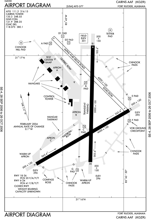 Cairns AAF has two asphalt paved runways: 6/24 is 4,546 by 150 feet (1,386 x 46 m) and 18/36 is 5,025 by 150 feet (1,532 x 46 m).