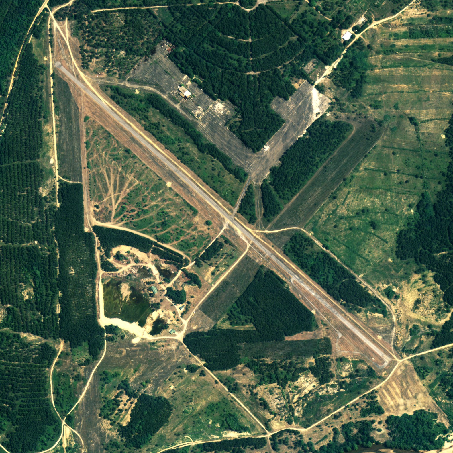 Sharpe Field (FAA LID: AL73) is a private use airport located six nautical miles (11 km) northwest of the central business district of Tuskegee, a city in Macon County, Alabama, United States. This airport is privately owned by the Bradbury Family Partnership. Formerly known as Tuskegee Army Airfield, Sharpe Field was to used train the Tuskegee Airmen during World War II. It provided advanced training for the graduates of nearby Moton Field. Most of the history of the Tuskegee Airmen was made at this site. HistoryThe Air Field was designed by the African American architect Hilyard Robinson and built in 1941. Construction began on July 12, 1941. Training flights began in November of the same year, even though construction was nowhere near completion. A graded (but not yet paved) portion of the north/south runway was used to conduct initial flight training. The earliest depiction of the Tuskegee AAF airfield which has been located was on the August 1942 14M Regional Aeronautical Chart (courtesy of Chris Kennedy). It depicted “Tuskegee” as a commercial or municipal airport. Tuskegee AAF was assigned to the Southeast Training Center of the Army Air Force Training Command. It was commanded by the 318th Army Air Force Base Unit. By the end of 1942, Tuskegee had a total of 3,414 personnel. The March 1943 14M Regional Aeronautical Chart labeled the airfield as “Tuskegee Army Flying School”, and indicated that the field had a control tower. By September 1943, Tuskegee had 4 runways & a total of 225 buildings. Aircraft used at Tuskegee during WW2 included the PT-17 biplane basic trainer, BT-13 monoplane advanced trainer, AT-6 Texan advanced trainer, and P-40 Warhawk (used for fighter transition training). Twin-engine training commenced at Tuskegee in 1943, at first using the AT-10. The 1944 US Army/Navy Directory of Airfields described Tuskegee AAF as having a 5,000' hard-surface runway As constructed during WW2, Tuskegee AAF consisted of 4 asphalt runways (the longest being 5,200'), taxiways, a ramp, and a large number of buildings north of the field During WW2, Tuskegee AAF had 2 satellite airfields: Griel Auxiliary #1, and Shorter Auxiliary #2 (still in use today as Shorter Airport). These 2 auxiliary airfield were not depicted on the November 1944 Birmingham Sectional Chart but they did appear on the April 1945 Birmingham Sectional Chart. The 1945 Birmingham Sectional Chart also depicted a "Tuskegee Institute #1" airfield, a few miles southeast of the town of Tuskegee, but no trace has been identified of this airfield on recent aerial photos. The AT-10 twin-engine trainer was replaced at Tuskegee by the TB-25 Mitchell in 1945. The last pilot class graduated at Tuskegee in 1946, bringing the total number of pilots trained at the base to 992. Tuskegee AAF was inactivated in 1946, and the property reverted back to the town of Tuskegee. Many of the base's buildings were moved into the town, and 2 of the hangars were relocated. Although the 1962 Birmingham Sectional Chart depicted Sharpe Field as having 4 paved runways (with the longest being 5,000'), the Aerodromes table included the remark "North/South only usable runway." Sharpe Field was reopened as a civilian airport at some point between 1945–62, as that is how it was listed in the 1962 AOPA Airport Directory. Sharpe Field was described as having a single 5,000' asphalt Runway 18/36, and the operator was listed as Sharpe Aviation Service The Tuskegee airfield was evidently closed once again at some point between 1965–71, as it was not listed among active airfields in the 1971 Flight Guide. In 1976, an attempt was made to reuse the abandoned base as an oil refinery, but this did not work out. It was depicted as an abandoned airfield on the 1998 World Aeronautical Chart. The site of Tuskegee AAF was purchased by the Bradbury Family Partnership in the year 2000 time frame. It is strictly a private development, however, in 2003 that Sharpe Field was once again listed as an active private airfield. Only one runway was listed as being active, the 5,300' asphalt Runway 14/32. The owner was listed as the Bradbury Family Partnership, of Woodstock, GA. The purpose of the airfield having been reactivated is unknown, although the old ramp area was used as an asphalt plant for a number of years. Some of the equipment can still be seen on the ramp area. FacilitiesSharpe Field covers an area of 2,600 acres (1,052 ha) at an elevation of 253 feet (77 m) above mean sea level. It has one asphalt paved runway designated 14/32 which measures 5,300 by 46 feet (1,615 x 14 m). The above content comes from Wikipedia and is published under free licenses – click here to read more.