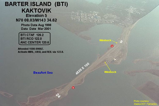 Barter Island LRRS Airport (IATA: BTI, ICAO: PABA, FAA LID: BTI) is a public/military airport located near the city of Kaktovik on Barter Island, in the North Slope Borough of the U.S. state of Alaska. The airport is owned by the North Slope Borough. It is also known as Barter Island Airport or Kaktovik Airport. The acronym LRRS stands for Long Range Radar Site or Long Range Radar Station. History