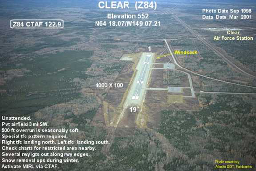 Clear Airport (ICAO: PACL, FAA LID: Z84) is a state-owned public-use airport located three nautical miles (6 km) southeast of the central business district of Clear, Alaska, United States.