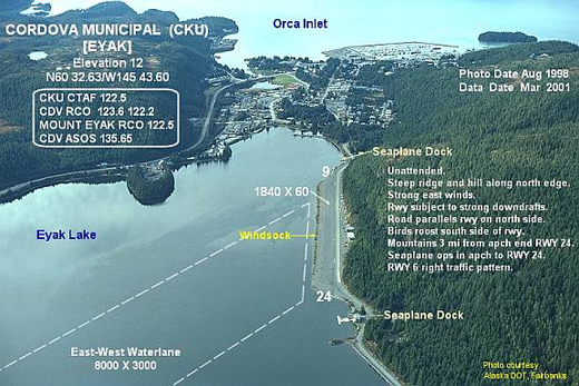 Cordova Municipal Airport (IATA: CKU, FAA LID: CKU) is a state-owned public-use airport located one nautical mile (1.8 km) east of the central business district of Cordova, a city in the Valdez-Cordova Census Area of the U.S. state of Alaska. It is located on Eyak Lake on which it also has a landing area for seaplanes.