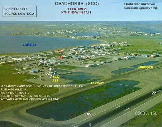 Diagram of Deadhorse Airport. US FAA image. Not to be used for navigational purposes Deadhorse Airport (IATA: SCC, ICAO: PASC, FAA LID: SCC) is a public airport located in Deadhorse on the North Slope of Alaska. It can be accessed from Fairbanks via the Elliott and Dalton highways. It is near Prudhoe Bay and is sometimes also called Prudhoe Airport. Facilities and aircraft