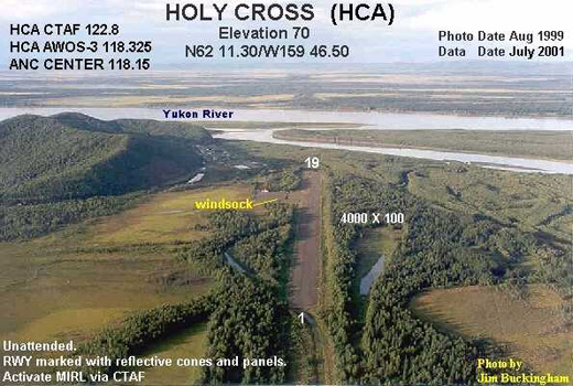 Holy Cross Airport has one runway (1/19) with a gravel and dirt surface measuring 4,000 x 100 ft. (1,219 x 30 m).