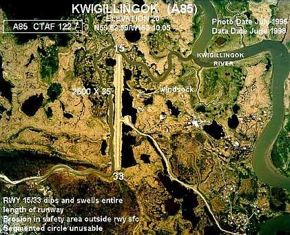 Kwigillingok Airport has one gravel runway (15/33) measuring 2,510 x 60 ft. (765 x 18 m).
