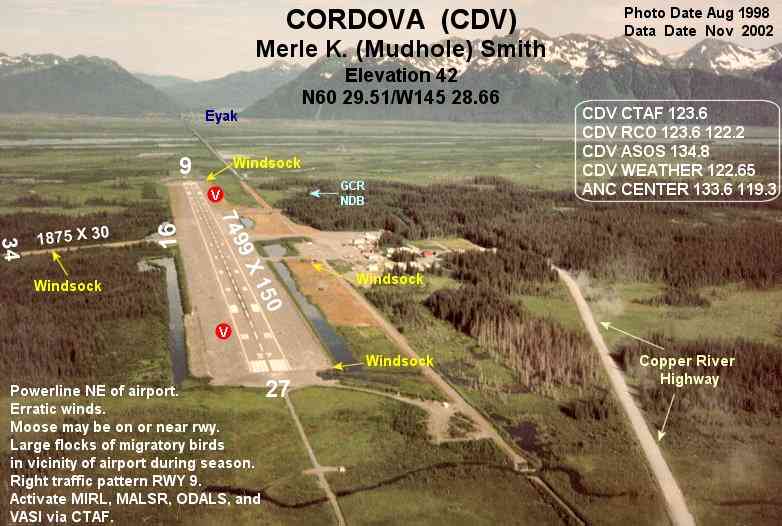Merle K. (Mudhole) Smith Airport (IATA: CDV, ICAO: PACV, FAA LID: CDV) is a state-owned public-use airport located 11 nautical miles (20 km) southeast of the central business district of Cordova, in the Valdez-Cordova Census Area of the U.S. state of Alaska. Airline service is subsidized by the Essential Air Service program. Facilities and aircraft