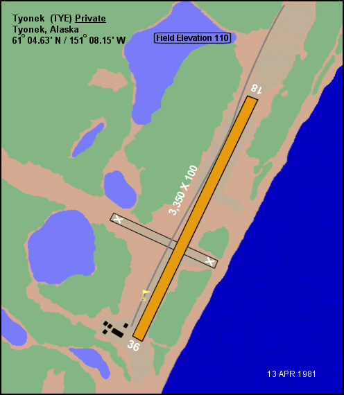Tyonek Airport (IATA: TYE, FAA LID: TYE) is a private-use airport located one nautical mile (1.85 km) northeast of the central business district of Tyonek, a village in the Kenai Peninsula Borough in the U.S. state of Alaska. It is owned by the Village of Tyonek.