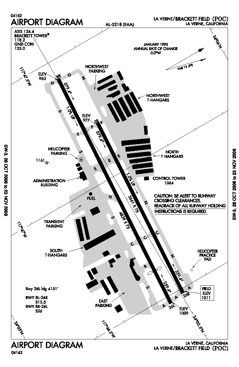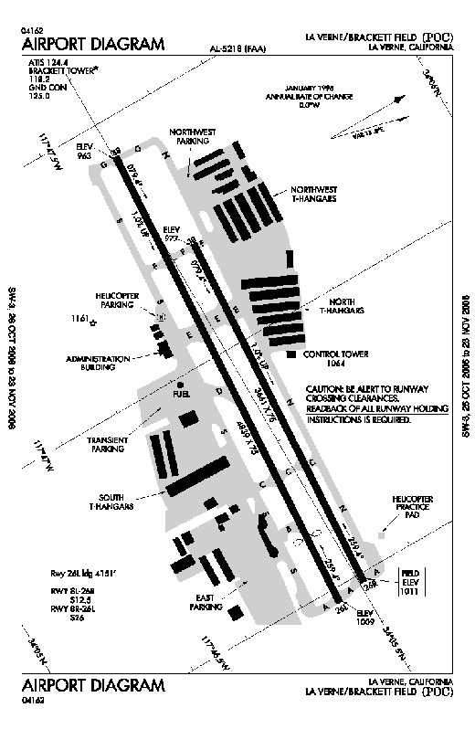 Brackett Field (IATA: POC, ICAO: KPOC) is a public airport located one mile (2 km) southwest of La Verne, in Los Angeles County, California, USA. It was named after Dr. Frank Parkhurst Brackett (1865–1951).