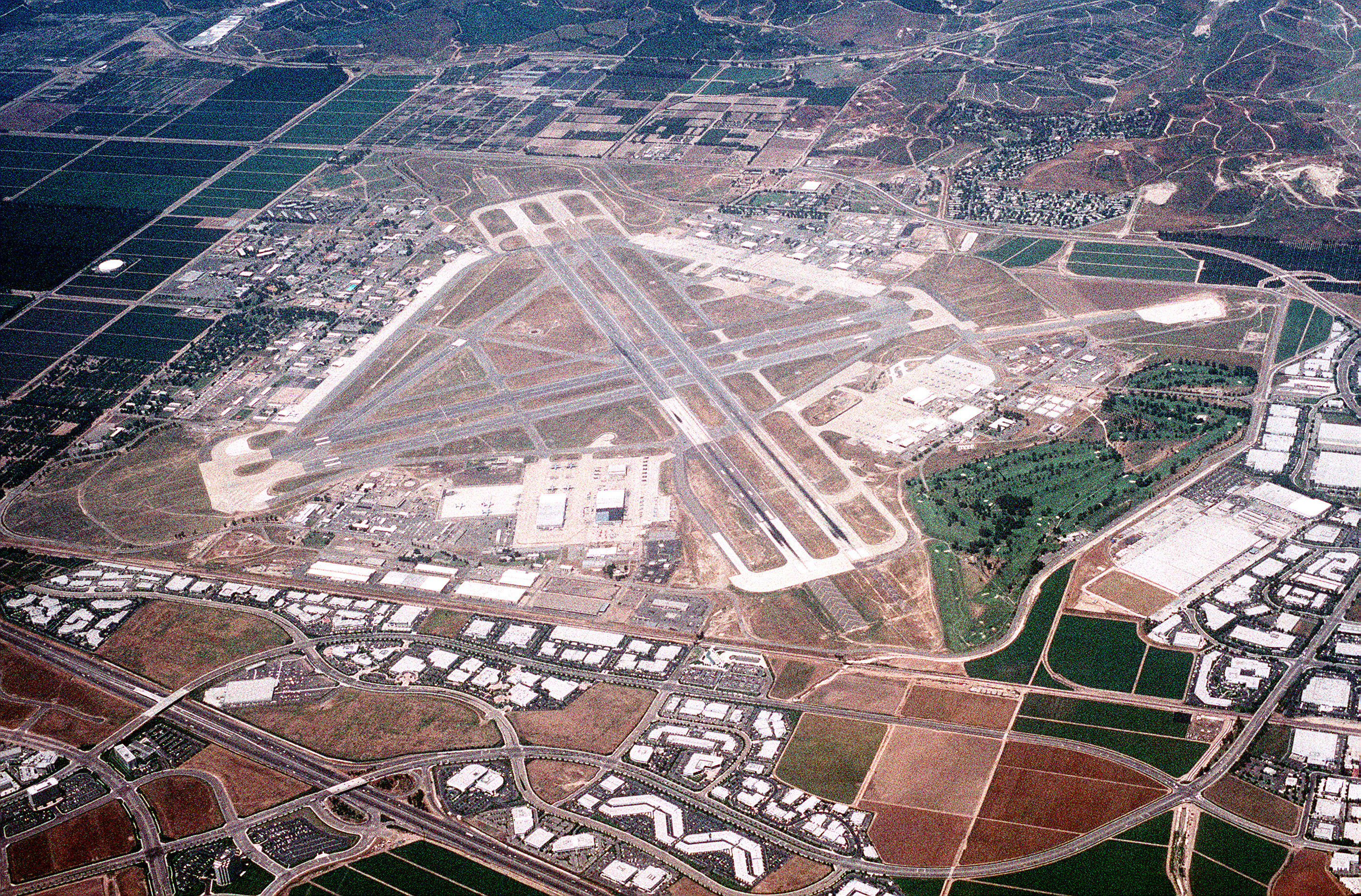 Overhead shot of MCAS El Toro taken in December of 1944. Marine Corps Air Station El Toro (IATA: NZJ, ICAO: KNZJ, FAA LID: NZJ) was a United States Marine Corps Air Station located near Irvine, California. Before it was decommissioned in 1999, it was the 4,682 acres (19 km) home of Marine Corps aviation on the West Coast. Designated as a Master Jet Station, its four runways (two of 8,000 feet (2,400 m) and two of 10,000 feet (3,000 m)) could handle the largest aircraft in the U.S. military inventory. While it was active, all U.S. Presidents in the post-WWII era landed in Air Force One at this airfield. The El Toro "Flying Bull" patch was designed by Walt Disney Studios in 1944. It survived virtually unchanged until the close of the Air Station. The land area originally taken by the air station is planned to be converted into a large recreational center, the Orange County Great Park. HistoryIn May 1942, Lieutenant Colonel William Fox was directed to select the sites for all of the Marine Corps' West Coast air stations. Fox sought the most expeditious and low cost option and thus chose the already existing airports of El Centro, Mojave and Santa Barbara. For the fourth station he chose land that had previously been looked at by the Navy for a blimp base. The Marine Corps gave the owner of the land, a farmer named James Irvine Sr., $100,000 for 4,000 acres (20 km) including 1,600 acres (6.5 km) designated for a blimp base. Construction of MCAS El Toro began on August 3, 1942 on land previously owned by the Irvine Company. The company greatly resisted the station's construction at this site, which at the time contained the largest lima bean field in North America, which was the company's prime source of revenue.. The name El Toro came from the nearby small community which in 1940 only had a population of 130 people. The base headquarters was established on November 4, 1942 and the first landing occurred in late November when a Major Micheal Carmichael, flying from Camp Kearny, was forced to make an emergency landing amongst the construction equipment. January 1943 saw the first operational units arriving at MCAS El Toro. First aboard were Marine Base Defense Aircraft Group 41 and VMF-113. They were followed later in the month by VMF-224, VMSB-231 and VMSB-232 who were returning from fighting during the Battle of Guadalcanal in order to re-organize, re-equip and train. Soon after its opening El Toro was handling the largest tactical aerodrome traffic on the Pacific Coast Already the largest Marine air station on the West Coast, in 1944, funds were approved to double its size and operations. By the end of 1944, the base would be home to 1,248 officers and 6,831 enlisted personnel. In 1950, El Toro was selected as a permanent Master Jet Station for the Fleet Marine Forces, Pacific. To support this new role, the aviation infrastructure at El Toro was again expanded significantly. For most of the ensuing years, El Toro served as the primary base for Marine Corps west coast fighter squadrons. In 1958, Marine Corps Air Station Miami was closed which brought the 3rd Marine Aircraft Wing to El Toro During the presidency of Richard M. Nixon, MCAS El Toro was used for flights to and from his "Western White House" at San Clemente, California. The land originally surrounding the base was mostly at agricultural use when it first opened, but it the late 1980s and early 90s, residential development started to begin in the area: most of it being directly in the path of the base's runways which proved to be a major problem as the constant loud noise produced by jets and choppers passing overhead was very irritating to those living in the area. Few desired to move there because of this, causing the new neighboorhoods to struggle. In 1993, MCAS El Toro was designated for closing by the Base Realignment and Closure Commission and all of its activities were to be transferred to Marine Corps Air Station Miramar. The station officially closed on July 2, 1999 . Base conversion controversyThe closing of MCAS El Toro ignited a political firestorm over the eventual fate of the facility. With its existing infrastructure, some favored converting the base into an international airport. Those favoring the new airport tended to come from northern Orange County, (desiring the convenience of a closer airport), and from areas in Newport Beach that are within the arrival and departure noise zones surrounding John Wayne Airport, (hoping to close that airport in favor of the new one at El Toro). Those against the airport proposal were largely residents of the cities in the immediate vicinity of El Toro, such as Irvine, Lake Forest, Laguna Niguel, Laguna Woods, Dana Point, and Mission Viejo, where residents were alarmed at the idea of the aircraft noise. The cities opposed to the airport created a joint powers authority, the El Toro Reuse Planning Authority (ETRPA) to oppose the project. They were joined in the effort by grass-roots organizations that collected record numbers of signatures on petitions to place anti-airport initiatives on the ballot and raised funds for the election campaigns. The volunteer-run El Toro Info Site [1] was the Internet voice of the movement and one of the first political blogs. This faction lobbied strongly in favor of other uses for the property. The city of Irvine sought to annex the property for park and related uses. The battle between pro-airport and anti-airport groups dominated Orange County politics for much of the late 1990s and early 2000s. Airport proposals were defeated in two hotly-contested ballot initiatives, and further challenges took place in the courts. Eventually the airport opponents prevailed, and in March 2002, the Department of Defense announced that it would sell the land to private interests to be developed into Orange County Great Park. This decision came right after the military stated that it wanted to return to the base. Environmental remediationBefore the site could be 