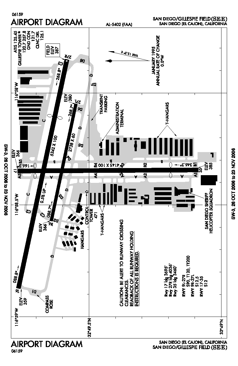Gillespie Field (IATA: SEE, ICAO: KSEE, FAA LID: SEE) is a county-owned public-use airport located 10 miles (16 km) northeast of the central business district of San Diego, in El Cajon, San Diego County, California, United States. History