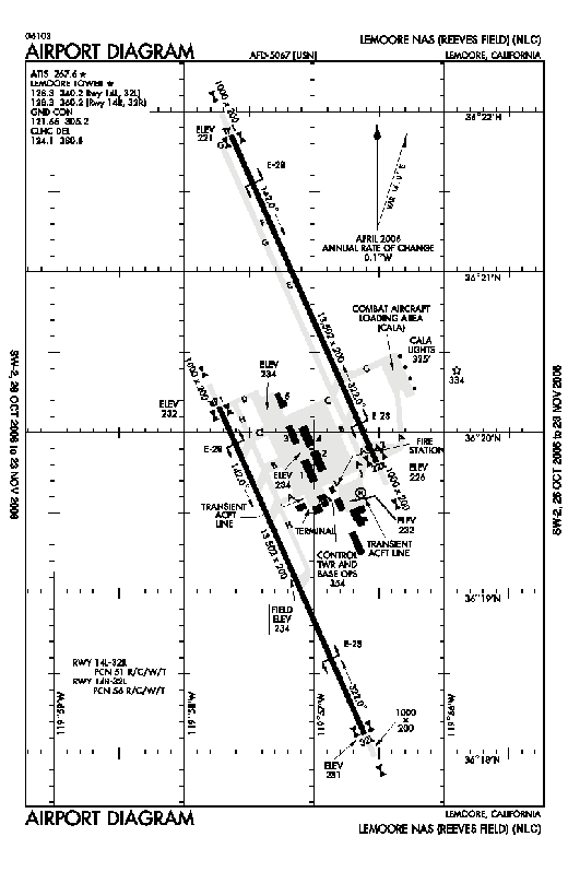 Commissioned in 1961, NAS Lemoore is the newest air station in the Navy. Two offset parallel runways were laid out 4,600 feet apart. Aircraft parking and maintenance hangars are aligned between the 13,500 foot runways. Separated from the hangars by underpasses beneath taxiways A & C, the remainder of the air operations area is located directly southeast.