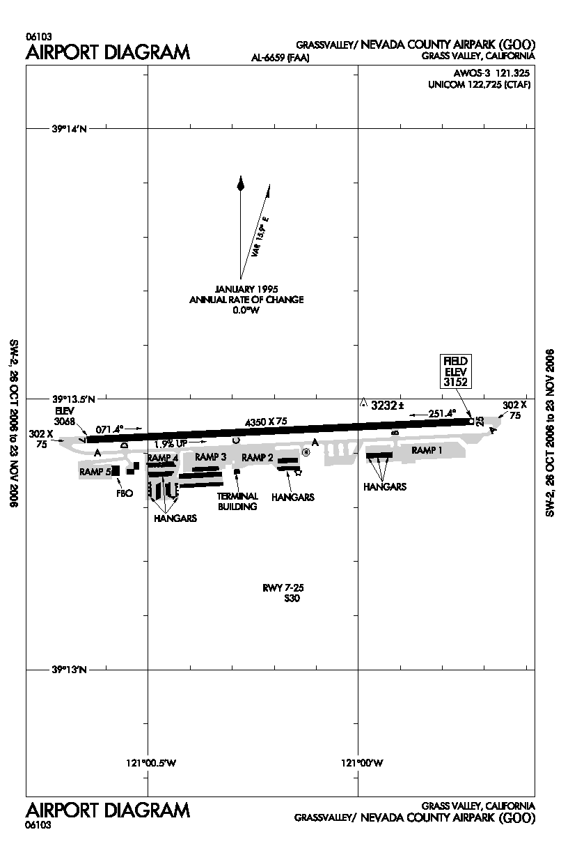 Nevada County Air Park covers an area of 117 acres (47 ha) at an elevation of 3,152 feet (961 m) above mean sea level. It has one asphalt paved runway designated 7/25 which measures 4,350 by 75 feet (1,326 x 23 m).