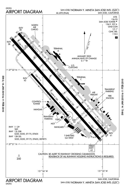 Norman Y. Mineta San José International Airport (IATA: SJC, ICAO: KSJC, FAA LID: SJC) is a city-owned public-use airport serving the city of San José in Santa Clara County, California, United States. It is a U.S. Customs and Border Protection international Port of entry. It is located two nautical miles (4 km) northwest of Downtown San Jose, near the intersections of three major freeways, U.S. Route 101, Interstate 880, and State Route 87. The airport's dominant carrier is Southwest Airlines. Alaska Airlines, along with its regional subsidiary, Horizon Air, is the second largest carrier at the airport. Alaska Airlines also operates most of its departing flights from the Bay Area out of SJC. The airport offers free Wi-Fi in all its terminal buildings. OverviewDespite San Jose's position as the most populous city in the Bay Area, SJC is the smallest of the three Bay Area airports offering scheduled service (10.9 million passengers annual in 2006), with less than one third the passengers of the region's major international airport San Francisco International Airport (SFO), and fewer passengers than Oakland International Airport (OAK). Like the Oakland airport, it attracts Bay Area residents who find SFO to be inconveniently distant from their homes. SJC is situated as a "downtown airport". Its relatively convenient location for residents and visitors near downtown San Jose has also led to some drawbacks. It became surrounded by the city and had little room for expansion. The proximity to downtown has also led to restrictions on heights of buildings in downtown San Jose by safety margins set in FAA regulations. HistoryBeginnings and ExpansionIn 1939, Ernie Renzel, a wholesale grocer and future mayor of San Jose, led a group that negotiated an option to purchase 483 acres (1.95 km) of the Stockton Ranch from the Crocker family, to be the site of San Jose's airport. Renzel led the effort to pass a bond measure to pay for the land in 1940. In 1945, test pilot James Nissen leased about 16 acres (65,000 m) of this land to build a runway, hangar and office building for a flight school. When the city of San Jose decided to develop a municipal airport, Nissen sold his share of the aviation business and became San Jose's first airport manager. Both Renzel and Nissen were instrumental in the development of San Jose Municipal Airport over the next few decades, culminating with the opening of what is now Terminal C in 1965. In the early 1980s San Jose International Airport was one of the first U.S airports to participate in the noise regulation program enacted by the U.S. Congress for delineation of airport noise contours and developing a pilot study of residential sound insulation. This program succeeded in its objective of demonstrating that residences in the airport vicinity could be retrofitted in a cost-effective manner to reduce interior sound levels from aircraft noise substantially. In 1990, San Jose International Airport greatly expanded with the opening of Terminal A. Plans at the time called for a Terminal B to be eventually built between Terminals A and C. In November 2001, the airport was renamed after Norman Yoshio Mineta, who is a native of San Jose, its former mayor and congressman, former United States Secretary of Commerce and former United States Secretary of Transportation. In December 2003, the airfield was named after former mayor Ernie Renzel. Current NewsIn August 2004, the city broke ground on the North Concourse, the first phase in a three-phase, nine-year expansion plan. The master plan, designed by Gensler and The Steinberg Group, called for a single consolidated terminal that contains 40 gates (eight more than present), an international concourse, and expanded security areas. The terminal would be named after James Nissen. The sail-shaped facade would greet up to 17.6 million passengers a year. A people mover system would link the new terminal with VTA light rail and the planned BART station adjacent to the current Santa Clara Caltrain station. Cargo facilities would be moved to the east side of the airport. A long term parking garage would be constructed at the current location of the rental car operations. A new short term parking structure would also be constructed at the site of current Terminal C short term parking lot. In November 2005, a scaled-back airport improvement plan was approved and announced. The new two-phase plan called for a simplified Terminal B, rather than the initially proposed James Nissen Central Terminal, with a North Concourse to replace the aging Terminal C. In addition, Terminal A would be expanded for additional check-in counters, security checkpoints, and drop-off/pick-up curbside space. The new plan cost $1.3 billion, less than half of the original plan's cost of $3 billion. The first phase was completed in June 2010, when Terminal B and the North Concourse officially opened for service. The second phase, adding a South Concourse to Terminal B, is to be built when demand is sufficient. Passenger Service HistoryEarly daysSan Jose's first airline flights were Southwest Airways DC-3s on the multistop run between SFO and LAX, starting in 1948-49. Southwest (later called Pacific) was the only airline until 1966, when PSA started flying Electras nonstop from LAX, with 727s later that year. (SJC's first airline jets were Pacific 727 nonstops to LAX earlier in 1966). In 1968 United Airlines arrived, with 727 nonstops from Denver, Chicago and LAX, and DC-8s from New York Kennedy and Baltimore. 1988-2008American Airlines opened a hub at San Jose in 1988, using slots it obtained in the buyout of Air California in 1986. Reno Air, a startup based in Reno, Nevada, took over many of American's gates until it was bought out by American in 1998. After the dot-com bubble burst in 2001, the city lost several flights because of a decrease in demand. Air Canada discontinued its flights to Toronto and Ottawa, Canada, and American Airlines stopped its nonstop flig
