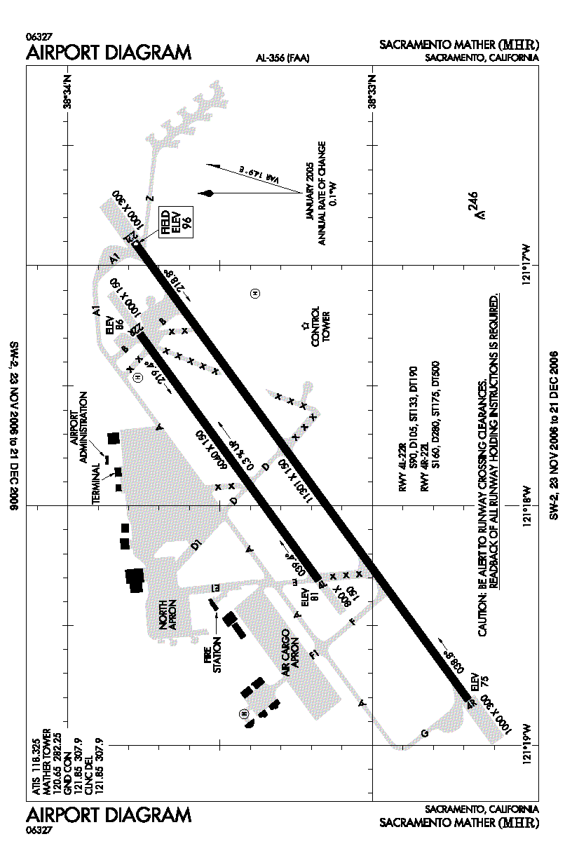Sacramento Mather Airport (IATA: MHR, ICAO: KMHR, FAA LID: MHR), also known as simply Mather Airport, is a county-owned public-use airport located 10 nautical miles (19 km) east of the central business district of Sacramento, in the city of Rancho Cordova, California, United States. It is located on the site of the former Mather Air Force Base which was closed in 1993. Facilities and aircraft