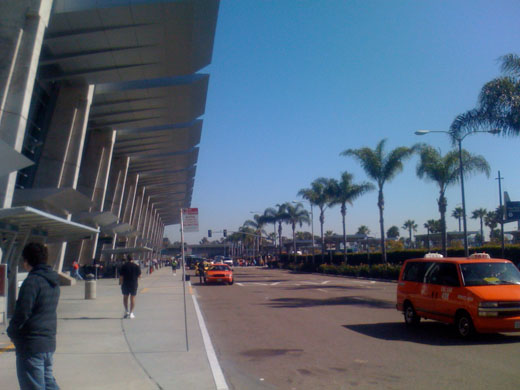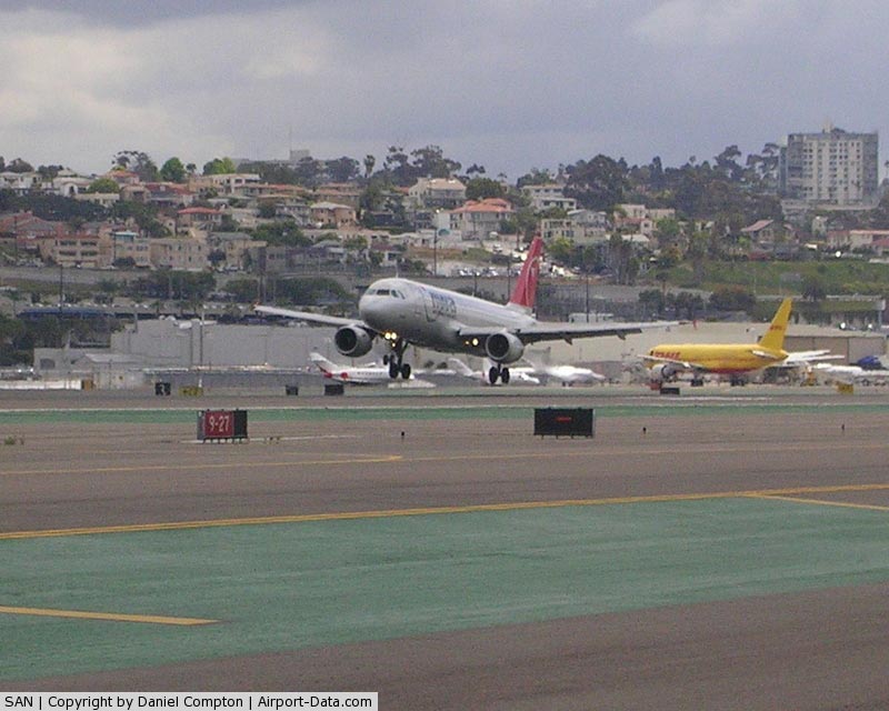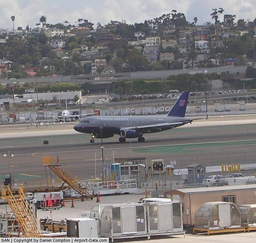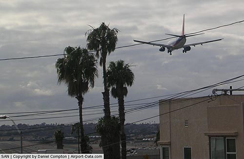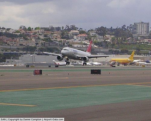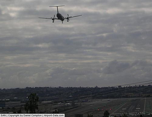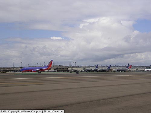 FAA diagram of San Diego International Airport San Diego International Airport (IATA: SAN, ICAO: KSAN, FAA LID: SAN), sometimes referred to as Lindbergh Field, is a public airport located 3 mi (4.8 km) northwest of the central business district of San Diego, California and 20 mi (32 km) from the Mexico – United States border at Tijuana, Mexico. It is operated by the San Diego County Regional Airport Authority. San Diego International is the busiest single-runway commercial service airport in the United States, and second in the world after London Gatwick, with approximately 600 departures and arrivals carrying 50,000 passengers each day, and a total of 18.3 million passengers in 2007. San Diego is the largest metropolitan area of the United States which does not serve as a hub nor secondary hub (or focus city) for any airline. The History Channel program Most Extreme Airports, ranks it as the 10th most dangerous airport in the world. The top three airlines in terms of market share are Southwest Airlines (36.2%), Delta Air Lines (10.9%), and American Airlines (10.6%). HistoryThe airport is located near the site of the old Ryan Airlines factory, but it is not the same as Dutch Flats, the Ryan airstrip where Charles Lindbergh flight tested the Spirit of St. Louis before his historic transatlantic flight. The site of Dutch Flats is on the other side of the Marine Corps Recruit Depot, in the Midway area, near the current intersection of Midway and Barnett avenues. Inspired by Lindbergh's historic flight and excited to have made the plane he flew, the city of San Diego passed a bond issue in 1928 for construction of a two-runway municipal airport to be operated by the city. Lindbergh himself encouraged the building of the airport and agreed to lend his name to it. The new airport, dedicated on August 16, 1928, was given the name San Diego Municipal Airport - Lindbergh Field, by which name it is still known. This naming occurred because San Diego was the city from which Lindbergh began the journey that would ultimately become the first solo transatlantic flight, in addition to being the place where his aircraft was designed, built, and tested, at Dutch Flats. The airport was the first federally certified airfield to serve all aircraft types, including seaplanes. The original terminal was located on the northeastern side of the field, along Pacific Highway. The airport also served as a testing facility for several early U.S. sailplane designs, notably those by William Hawley Bowlus (superintendent of construction on the Spirit of St. Louis) who also operated the Bowlus Glider School at Lindbergh Field from 1929-1930. On June 1, 1930, a regular San Diego-Los Angeles airmail route was initiated. The airport gained 'international airport' status in 1934, and a United States Coast Guard Air Base located adjacent to the field was commissioned in April 1937. The Coast Guard's fixed-wing aircraft made use of the runway at Lindbergh Field until the mid 1990's when the fixed-wing aircraft were retired. World War II brought significant change to the airfield when the Army Air Corps took it over in 1942 to support the war effort. The infrastructure of the airport was improved to handle the heavy bombers being manufactured in the region during the war. This transformation, including an 8,750 ft (2,670 m) runway, made the airport "jet-ready' long before jet passenger planes came into widespread service. After the war, commercial air service at Lindbergh Field expanded rapidly. Pacific Southwest Airlines established its headquarters in San Diego and inaugurated service at Lindbergh Field in 1949 to points throughout California. In 1960, Lindbergh Field gained its first jet service, with American Airlines and United Airlines operating the Boeing 720 to Phoenix and San Francisco, respectively. The original terminal on the north side of the airport was used until the 1960s, but by that time, air traffic in San Diego had increased considerably and new facilities were needed badly. As downtown San Diego developed, one of the airport's two runways was closed leaving only one functional runway. The current Terminal 1 was opened on the southern side of the airport property on March 5, 1967. It was not until July 11, 1979 that Terminal 2 was opened. A third terminal, dubbed the Commuter Terminal, opened on July 23, 1996. Terminal 2 was later expanded by 300,000 square feet (30,000 m) in 1998. In the 1990s, the official name of the airport became San Diego International Airport, but is still often referred to as Lindbergh Field by the local residents. There use to be a non stop flight to London-Heathrow operated by British Airways, but service was terminated in 2003. Originally funded, built and operated by the City of San Diego, then the San Diego Unified Port District, the airport is now operated by the San Diego County Regional Airport Authority. The Green BuildSan Diego International Airport's expansion program, dubbed "The Green Build", is expected to help the airport meet current and future travel demands. Expected to be complete in early 2013, the project focuses on expansion and enhancements at Terminal 2. Additions include 10 new gates on the west side of Terminal 2 West, a dual-level roadway separating arriving and departing passengers, additional security lanes, and an expanded concession area. Flight operationsThe vast majority of takeoffs and landings at SAN are from east to west. Landing at the airport from the east (the most common approach) offers dramatic closeup views of skyscrapers, Petco Park (home of the San Diego Padres), and the Coronado Bridge from the left side of the aircraft. On the right, Balboa Park, site of the 1915-1916 Panama-California Exposition, can be seen, along with the San Diego Zoo and several freeways. The approach from the east is steep, necessitated by terrain which drops from 266 ft (81 m) to sea level in less than one nautical mile. Aircraft normally descend at 318 feet pe