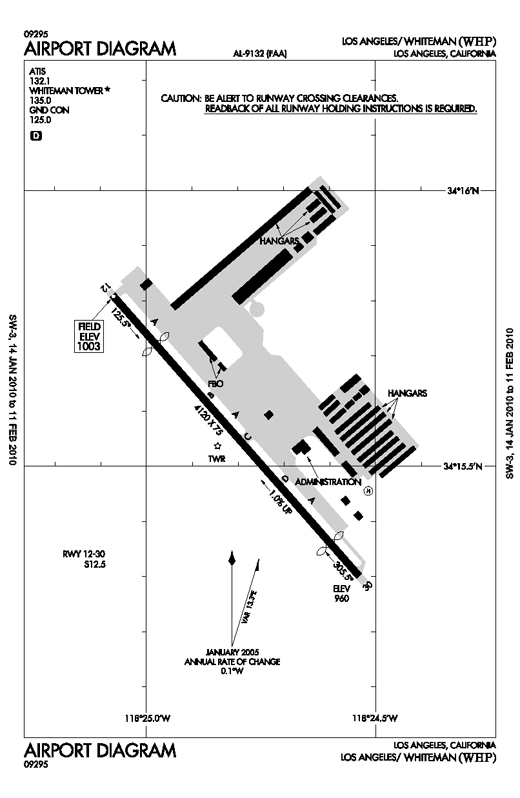 Whiteman Airport covers 184 acres (74 ha) and has one runway:
