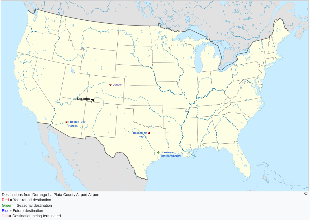 The airport has three boarding gates, five plane stands, a pre-security restaurant, and a gift shop. It has free wi-fi internet throughout the passenger terminal. Destinations map Historical airline serviceThe first scheduled airline service to the La Plata County Airport began on November 27, 1946, when Monarch Air Lines initiated flights to Denver with stops at Monte Vista, Canon City, Pueblo, and Colorado Springs, Colorado. Douglas DC-3 aircraft were used. By April 1, 1947, new routes were added to Albuquerque and Salt Lake City, each making several stops en route. Durango would be the connecting hub for the three routes. On June 1, 1950, Monarch was merged into Frontier Airlines (1950-1986) and a new route to Phoenix was added making five stops. The flights to Albuquerque and Salt Lake City had ended in the early 1950s as they were redirected through Farmington, New Mexico which then became Frontier's connecting hub for the four corners states. In 1959 Frontier acquired 44-passenger Convair 340 aircraft and new nonstop flights were added from Durango to Denver as well as new flights to Phoenix and Tucson that only stopped in Farmington. By 1966 the Convair 340s had been upgraded to Convair 580 turboprop aircraft and all of the original Douglas DC-3 aircraft had been retired. Direct flights to Albuquerque were reinstated in 1969. During the summer of 1977, the La Plata County Airport was closed so that the main runway could be extended to handle jet traffic. Frontier Airlines then initiated the first jets to the airport in November 1977 with Boeing 737 flights to Denver making one stop in Pueblo, Colorado. Weekend flights were also added to Dallas/Fort Worth for the 1977–78 ski season. The flights to Phoenix, still operating with Convair 580s, were discontinued in 1979 and flights to Albuquerque ended in 1981. On June 1, 1982, Frontier had retired its Convair 580 aircraft fleet and was operating all 737 jets at Durango, now with nonstop flights to Denver and return flights stopping in Farmington. More weekend ski season jet flights were added to Dallas/Fort Worth, Houston, Atlanta, and Los Angeles for the 1982–83, 1983–84, and 1984–85 winter ski seasons. The 737 jets to Denver ended on October 1, 1984, and were replaced with Convair 580s operated by Frontier Commuter. Frontier Commuter ended all service in January 1985 and after Frontier's ski season flights ended by April 1, 1985, all Frontier representation at Durango was discontinued. Since the beginning of airline deregulation in 1978, many carriers, small and large, have served Durango: Aspen Airways flew to Denver from late 1978 through 1990 using Convair 580s and in 1985 introduced British Aerospace BAe 146-100 jets. In 1986 Aspen became a United Express feeder carrier for United Airlines at the carriers' Denver hub. Aspen also flew to Albuquerque briefly in 1979 and again for the winter 1989–90 ski season. Rocky Mountain Airways briefly flew to Denver in January 1979 using de Havilland Canada DHC-7 Dash 7s. The carrier returned from 1987 through 1991 operating as Continental Express again using Dash-7s as well as ATR 42s, and Beechcraft 1900Cs. Zia Airlines flew commuter flights to Albuquerque in early 1980 using Handley Page Jetstreams. Desert Pacific Airlines flew to Los Angeles in 1980 making five stops en route and using Piper Navajos. Sun West Airlines flew to Albuquerque and Phoenix from 1980 through 1984 using Piper Navajos and later upgrading to Beechcraft C99s. Mesa Airlines operated multiple services at Durango. Flights to Albuquerque began in 1983 with Beechcraft C99s, later upgrading to Beechcraft 1900Ds and the Albuquerque flights were operated on and off through 2005. Service to Denver began in 1990 as United Express and continued into 1998 using Beechcraft 1300s and 1900s and later upgraded with Embraer EMB-120 Brasilias and de Havilland Canada DHC-8 Dash 8s. Service to Phoenix began in 1987 and was changed to America West Express in 1992. Beechcraft 1900s, Embraer Brasilia's and Dash-8's were all used. Canadair CRJ-200 regional jets were introduced in 1999. America West Airlines merged into US Airways in 2007 at which time the Phoenix flights began operating as US Airways Express. Then in 2015 US Airways merged into American Airlines which changed the Phoenix flights to American Eagle. All flights were upgraded with Canadair CRJ-900 aircraft a short time later and continue operating today. Pioneer Airlines flew to Albuquerque and Denver in 1982 and 1983 using Fairchild Swearingen Metroliners. Trans-Colorado Airlines began Durango service in mid 1983 with service to Denver and later added flights to Albuquerque and Colorado Springs using Fairchild Swearingen Metroliners. The carrier became a Continental Express feeder in 1986 and continued the Denver flights through 1988 adding the Convair 580 aircraft as well. America West Airlines operated mainline Boeing 737 jet service to Phoenix from 1984 through 1991. Some flights would stop at Albuquerque or Grand Junction. The 737 jets were replaced with Dash-8 props from 1991 through 1992 then service was contracted out to Mesa Airlines as America West Express. Britt Airways followed Rocky Mountain Airways by operating Denver flights as Continental Express from 1991 through 1994 using Beechcraft 1900s and ATR 42s. GP Express then followed Britt Airways by operating Continental Connection service to Denver from 1994 through 1995 using Beechcraft 1900s. American Airlines began ski season service during the winter of 1994–95 with flights to Dallas/Fort Worth using McDonnell Douglas MD-80 mainline jets. The service continued for seven winter ski seasons, ending with the 2000–01 season. Reno Air operated one daily flight to Albuquerque which continued on to Los Angeles for the 1996–97 ski season. A McDonnell Douglas MD-80 jet was used. Air 21 flew a single daily flight to Grand Junction, Las Vegas, Los Angeles, and Fresno for a short time in late 1996 using a