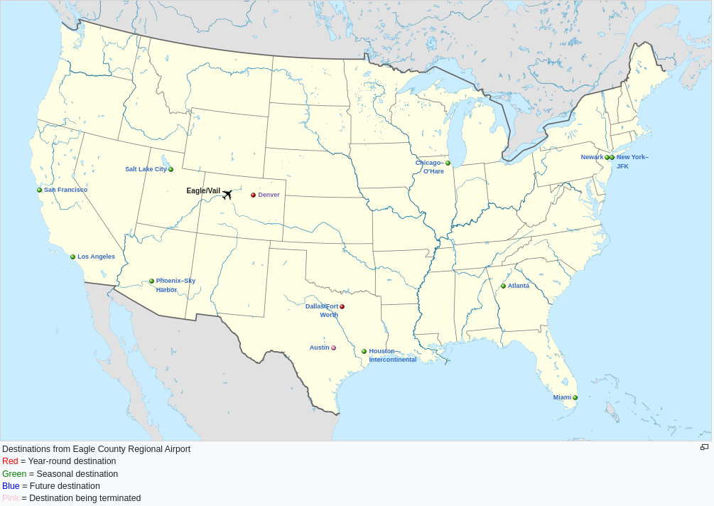 Destinations map Early historyLouise Ellen Cooley bought a plot of land in 1911 that served as the foundation for building what would become Eagle County Regional Airport. The area became an attraction to local residents as barnstormers used the strip to perform aerial tricks and maneuvers. Harry A. Nottingham (Eagle County Commissioner) was eager to see a fully functional airport for Eagle County. New plans for the airstrip were laid out in 1939 by an engineer from Denver's Airport District Office. Mr. Nottingham borrowed $20.00 for the development of a gravel road which would connect the air strip to the towns of Eagle and Gypsum Eagle County Airport was officially dedicated for service as a fully functioning airport on September 14, 1947. Past air serviceDuring the mid- and late 1970s, only one airline scheduled passenger service into the airport: Rocky Mountain Airways, which flew STOL capable de Havilland Canada DHC-6 Twin Otters followed by larger, 50-seat STOL capable de Havilland Canada DHC-7 Dash 7s nonstop from Denver Stapleton Airport and Aspen. In the late 1970s through the mid-1980s, Rocky Mountain Airways nonstops to Denver were all flown with the larger Dash 7. The April 1, 1987, Official Airline Guide (OAG) listed three airlines serving the airport: Rocky Mountain Airways operating as Continental Express for Continental Airlines via a code sharing agreement with Dash 7 flights from Denver, Royal West Airlines operating nonstop British Aerospace BAe 146-100 jets from Los Angeles (LAX) on Saturdays, and commuter air carrier Monarch Airlines operating Twin Otters from Aspen, Crested Butte, Grand Junction and Telluride. In August 1985 runway 8 at the airport was 5000 ft in length by 60 ft in width with its west end located at 39.6452°N 106.92145°W; by December 1987, runway 7 had been added on its present alignment, 7000 ft by 100 ft, with its LDA approach which then permitted operations with larger mainline jet aircraft. The airport was being served by mainline jets in early 1994: American Airlines Boeing 757-200s nonstop from Chicago O'Hare Airport, Dallas/Fort Worth, Miami, and New York La Guardia Airport, Delta Air Lines Boeing 727-200s from Salt Lake City, Northwest Airlines Boeing 757-200s from Minneapolis/St. Paul, and United Airlines Boeing 737-300s from Denver. The OAG lists 36 jet flights a week operated by these four airlines into the airport early in 1994. Air Canada began flying an Airbus A319 nonstop from Toronto Pearson in 2013 by pre-clearing passengers in Toronto since the airport does not have custom facilities. Air Canada dropped the route after the 2017/2018 winter ski season due to relocating its A319s to other U.S. destinations. StatisticsTop destinations