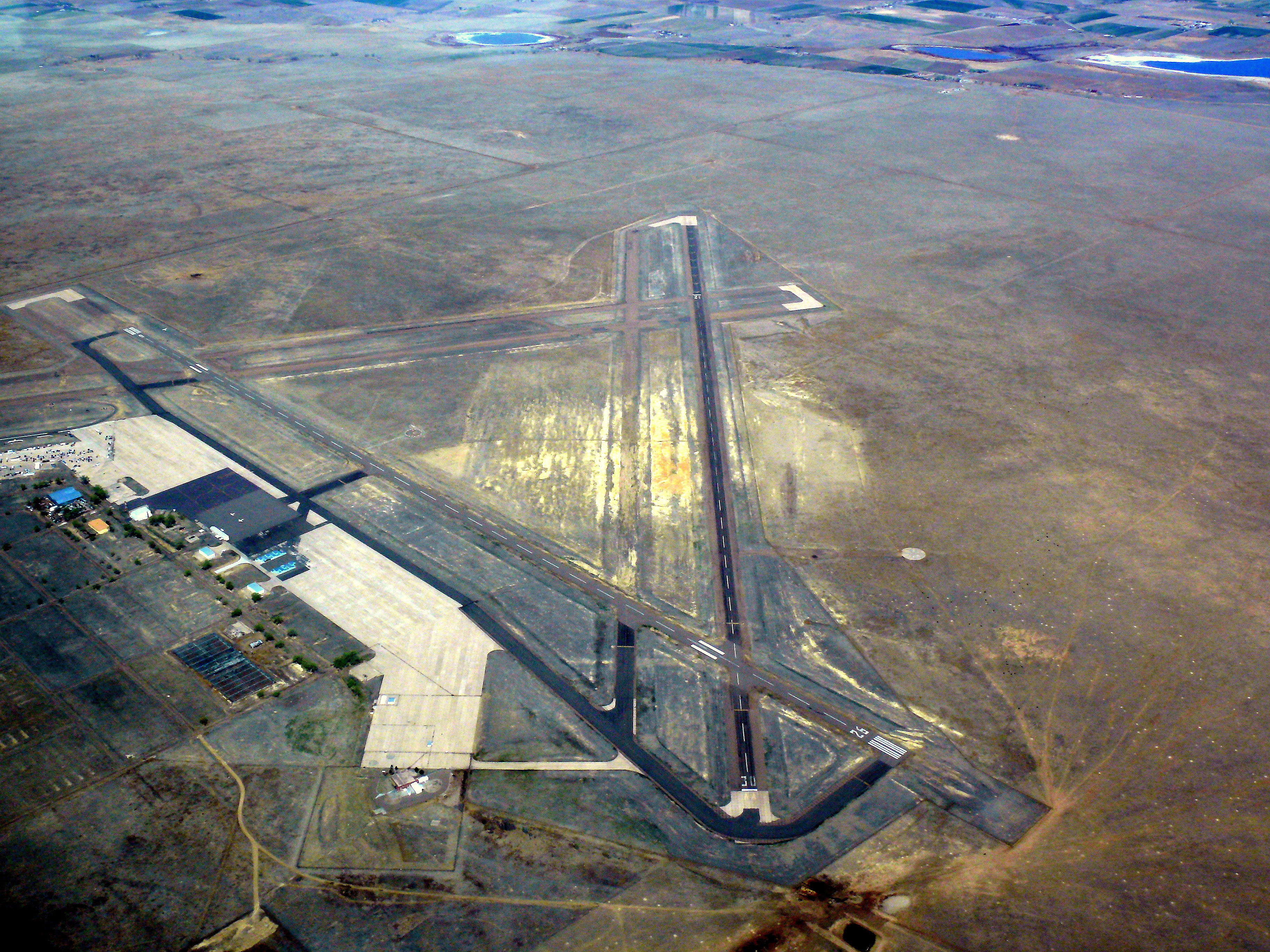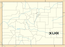 La Junta Municipal Airport (ICAO: KLHX, FAA LID: LHX) is three miles north of La Junta, in Otero County, Colorado, United States. The National Plan of Integrated Airport Systems for 2011–2015 categorized it as a general aviation facility. Many U.S. airports use the same three-letter location identifier for the FAA and IATA, but this airport is LHX to the FAA and has no IATA code. HistoryLa Junta Municipal Airport in April 2008 from an altitude of 9500ft MSL. Photo - Public Domain. The history of the airport began in 1935 with initial development by the Civil Aeronautics Authority. In 1940 the War Department leased the facility for civil pilot training of British RAF and Royal Canadian Air Force pilots in four-engine aircraft. In 1942 the airport was taken over by the United States Army Air Forces and assigned to the Western Flying Training Command (WFTC) and the airfield was expanded to accommodate a large number of aircraft and training flights. Three asphalt runways were constructed in a triangle layout, 8000x150 (NE/SW), 8000x150 (E/W), 8000x150 (NW/SE) along with a large aircraft parking apron, taxiways, landing aids and several large aircraft hangars. In addition, four auxiliary airfields were constructed to accommodate training flights and emergency landings: Former La Junta AAF's Arlington Auxiliary Airfield#4: view from the SW corner of the triangular runway looking WNW, 2006 Photo by LanceBarber, CC BY-SA 3.0.