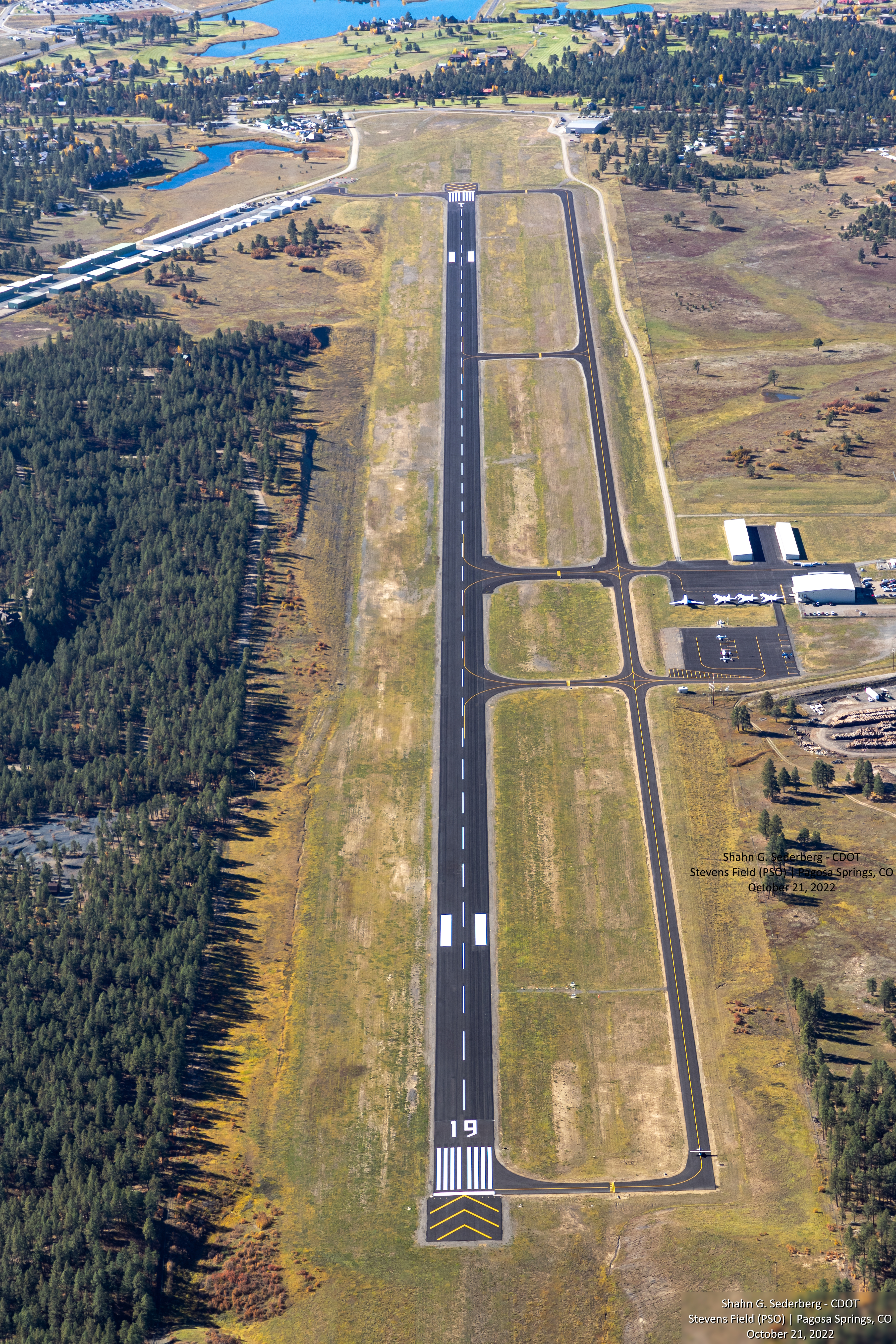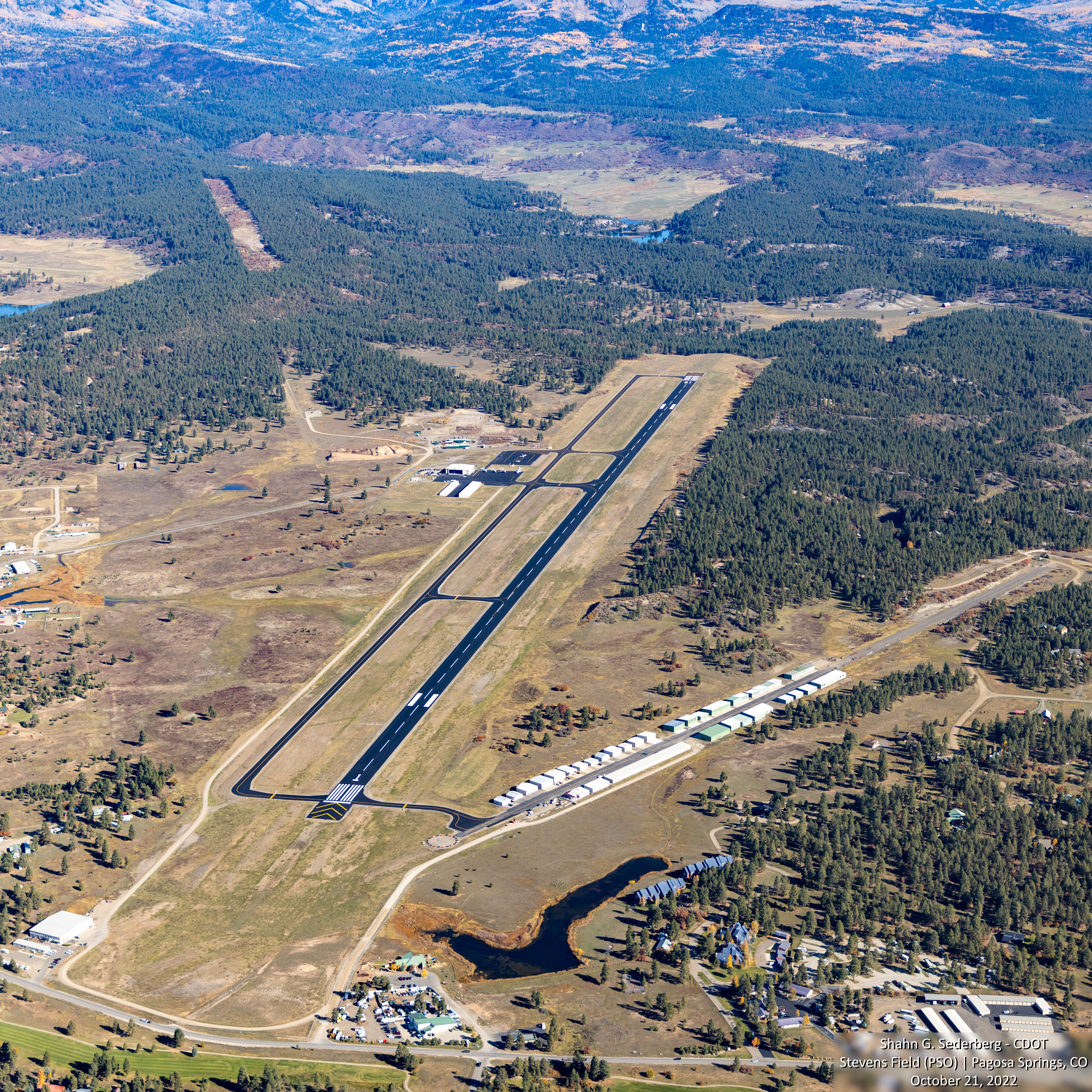 Stevens Field (IATA: PGO, ICAO: KPSO, FAA LID: PSO) is a public-use, general aviation airport located three miles northwest of the central business district of Pagosa Springs in Archuleta County, Colorado, United States. It is publicly owned by Archuleta County. It has no air traffic control tower or commercial passenger services, but it does have a fixed base operator (FBO), and it is popular among light sport and general aviation aircraft doing cross country flights, where the airport serves as an GA-friendly waypoint, refueling stop, and pilot rest/sleep opportunity. Its address is 61 Aviation Ct, Pagosa Springs, CO. The airport can be found referred to by many other names, including "Pagosa Airport", "Pagosa Springs Airfield", numerous hyphenated variants, and "Archuleta County Airport" (especially used by the county itself, which operates the airport). These names are local nomenclatures, however, and are not legally recognized by the FAA, Colorado Department of Transportation, or other official transportation authorities. Facilities and aircraftStevens Field covers an area of approximately 328 acres (133 ha) at an elevation of 7,663 feet (2,336 m) above mean sea level. It has one runway designated 01/19 with an asphalt surface measuring 8,100 by 100 feet (2,469 by 30 m). Due to the nature of the surrounding mountains and elevation, larger aircraft are generally advised to only depart from and land on runway 19 (e.g., heading south). The airport's fixed base operator (FBO) provides an attended pilot lounge with seating, restrooms, free WiFi, and full service refueling. The airport also provides at least one courtesy vehicle that can be used by visiting pilots for free on a first-come-first-serve basis, limited to day or overnight use and travel in the immediate vicinity. The airport operates in Class G airspace, and Class E above it begins at 700 feet AGL. The airport hosts a variety of traditional and 'non-traditional' flying and aircraft, including fixed wing, weight shift, powered parachutes (PPC), powered paragliders (PPG), and hang gliders. Balloonists operate in the area year round, and will frequently cross over and through the airport's airspace heading east to west, especially in early mornings when launched from Pagosa Springs. For the 12-month period ending December 31, 2020, the airport had an average of 255 aircraft operations per week: 59% transient general aviation, 38% local general aviation, and 3% military. Communications and informationThe use of a two-way aviation band radio is not technically required, but is strongly recommended for all pilots and other operators in the area, especially due to the diversity of aircraft in the area and the significant difference in approaching airspeed between them. Because there is no air traffic control tower at the airport, all ground and air traffic communicate using a common traffic advisory frequency (CTAF) of 122.700 MHz (UNICOM). Weather information is collected by an onsite FAA-certified automated airport weather station (AWOS-3) and broadcast at 127.175 MHz (station KPSO); alternatively it can be heard by calling a local telephone number, as provided in the FAA information portal, or found as a METAR online through the NOAA's Aviation Weather Center. Nearby mountain weather in Wolf Creek Pass - which can significantly impact flight operations in the area - is also collected by an AWOS-3 (station KCPW) and broadcast at 121.125 MHz. HistoryStevens Field (PSO) - Looking North. Photo by Shahn G. Sederberg, CC BY-SA 4.0. In 1961, rancher Johnny Stevens donated 40 acres of land, while Agapita Gomez donated a smaller parcel, that together established the original airport location. The first runway was a gravel strip, built as a community project (runway 4/22). According to local interviews, Vic Poma and other local businessmen brought in their own equipment - including tractors, bulldozers and the occasional wheelbarrow – and furnished the rock and gravel. That runway was eventually paved in later years following greater oversight of the airport by Archuleta County, and today it functions as an adjoined taxiway along which numerous hangars house general aviation aircraft. It is located in alignment with Condor Drive. Stevens Field (PSO) - Looking South. Photo by Shahn G. Sederberg, CC BY-SA 4.0. For many years local Vic Poma, who worked at the Texaco Station provided fuel for aircraft. There were three hangars on the west side of the airport, as well as a hangar and small apartment belonging to M.O. Smith, another Pagosa Springs aviator. In 1975, a fixed based operator called Pagosa Springs Aviation began offering charter services, flight instructions, and fuel sales. The business was initially operated from M.O. Smith’s hangar/apartment building, until the county built a Terminal Building and leased it to Pagosa Springs Aviation, which became the FBO site in 1976. The FBO manager would often lend his truck to a visiting pilot who needed to go into town, while the manager’s wife fueled a visitor’s plane. Runway 01/19 at Stevens Field with the San Juan Mountains to the north. Photo by Jeffrey Beall, CC BY 4.0. Records of when the current primary runway was established are unclear. At some point in the early 1980s, the new primary runway was established and built (runway 1/19). In 1982, Nick Nichols purchased the property owned by M.O. Smith (at the southwestern end of runway 1/19) and built a large hangar and office building known as Nick’s Hangar. The building was later donated to the county by Mr. Nichol’s estate. Since that time, it has been home to various FBOs, including FlightCraft Aviation, Flight Crafton, and WindDancer Aviation, and Avjet Corporation, as well as Archuleta County’s own airport operations. As the population of Archuleta County grew, the demands for aviation services increased: air ambulance services were often required; fire-fighting crews arrived and camped at Stevens Field when the need 