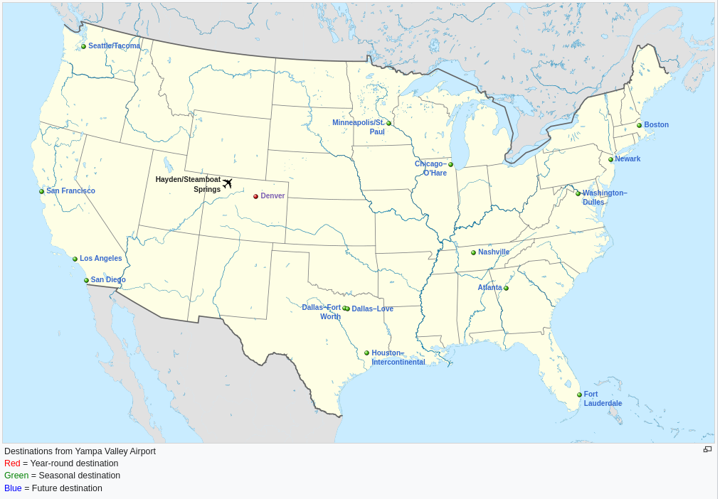 Yampa Valley Regional Airport (IATA: HDN, ICAO: KHDN, FAA LID: HDN) is in Routt County, Colorado, United States, serving the communities of Steamboat Springs, Hayden, and Craig, Colorado. The airport is two miles southeast of Hayden, about 20 miles east of Craig and about 25 miles (40 km) west of Steamboat Springs. It has the only scheduled passenger flights in northwest Colorado.
