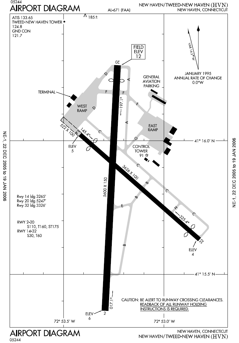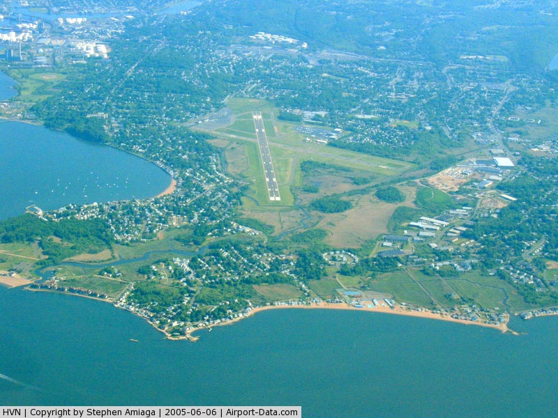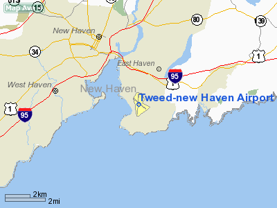 Tweed New Haven Regional Airport (IATA: HVN, ICAO: KHVN, FAA LID: HVN), formerly known as Tweed-New Haven Airport, is a public airport located three miles (5 km) southeast of the central business district of New Haven, Connecticut, United States. Tweed New Haven Regional Airport is currently owned by the City of New Haven. The airport property is located within New Haven and the town of East Haven. HistoryEarly history Tweed was dedicated on August 29, 1931, as the New Haven Municipal Airport. It was renamed Tweed in 1961 in honor of John H. Tweed, its first airport manager. Air service was provided by American Airlines, beginning service in the 1930s, and later by Allegheny Airlines. 1970s and 1980s In the 1970s and 1980s the "major carriers" left New Haven to focus service at larger airports. Regional or "commuter" carriers grew to fill the gaps left by major airlines. Fixed Base Operator "New Haven Airways" started providing scheduled air service to fill the void, and became New Haven's home town airline NewAir. The airline operated flights to New York's JFK and LaGuardia Airports, Philadelphia, Baltimore/Washington International, and Washington National Airports, using Twin Otters, EMB-110s, and Shorts-360s. Competing for New Haven's air travelers was Groton/New London based Pilgrim Airlines, also operating flights to New York/JFK and LaGuardia, as well as Boston, using Twin Otters and F-27 aircraft. By the mid 1980s, the two competing Connecticut based airlines merged together, and then was purchased by Hartford based Business Express Airlines, which was initially flying only from Hartford/Bradley Airport to Boston and Philadelphia. In 1987, after the merger of People Express Airlines and Continental Airlines, Hyannis MA based Provincetown-Boston Airlines (PBA), which operated as a commuter airline owned by People Express and then Continental Airlines, began service at New Haven. PBA operated flights from Tweed/New Haven to Continental's hub at Newark International Airport, as well as providing service to Hyannis and Nantucket, using EMB-110 aircraft. US Air Express also provided service to Philadelphia and Washington DC. In the 1990s, new jet service was added from New Haven to Chicago/O'Hare, initially using Air Wisconsin's BAE-146 aircraft as a "United Express" carrier. Soon after, United replaced the Air Wisconsin service with its own 737 aircraft. The service was short lived, with United likely realizing that the service only competed with its own service from Hartford/Bradley. Continental Express service continued, and was upgraded to Beech-1900 and ATR-42 aircraft; while Business Express flights upgraded to Saab-340 and Beech-1900s. By the late 1990s, Business Express service ended, as it put its Saab-340s out of service, after is acquisition by AMR Corporation. Continental Express service ended for a while in the 1990s, then came back, and then left again by the late 1990s. The airport was also served by Comair, a Delta Connection carrier that offered service to and from Cincinnati-Northern Kentucky International Airport. This service was discontinued in January 2006. Pan Am Clipper Connection, which was operated by Boston-Maine Airways, began non-stop service to Baltimore-Washington International Thurgood Marshall Airport, Hanscom Field, and Pease International Airport on March 8, 2007 using 19 seat Jetstream 31 aircraft. Service was discontinued on 30 July 2007. This then left the US Air Express service as the lone survivor of scheduled air service at Tweed/New Haven. Present dayUS Airways Express, which formerly flew from New Haven to both Philadelphia and Reagan National Airport in Washington, D.C., now is the only passenger airline that offers daily flights in and out of Tweed New Haven to Philadelphia. The airport is also popular with both private aircraft and companies providing flights for tourists who want to view the Connecticut shoreline from the air. During major events at Yale University, the general aviation ramp is often crowded with private jets - during the 1997 commencement, the corporate jets of Coca Cola and Procter & Gamble were parked nose to nose on the tarmac. The airport also gets heavy use during the annual Pilot Pen Tennis tournament. Today the airport is operated by AvPorts of Teterboro, New Jersey, under contract by the Tweed-New Haven Airport Authority. Public transit to the airport is available on Connecticut Transit's "G" route. Future plansThe future of the airport has been the subject of disagreement between the City of New Haven and the Town of East Haven. New Haven has advocated airport runway expansion, which would be required to attract more commercial air service and larger planes. However, many East Haven residents have been opposed, alleging that expansion would negatively affect the mostly residential neighborhoods surrounding the airport. In 2007, the Federal Aviation Administration and the State of Connecticut approved the proposed addition of safety overruns to Tweed's main runway. The City of New Haven issued the necessary wetlands and building permits for the project. However, officials in the town of East Haven voted to reject the upgrade proposal and deny permits for work on the East Haven (North) side; the Airport Authority and the City of New Haven filed a lawsuit against the Town of East Haven to allow for work to proceed on the north overrun and won. Since the lawsuit, The Airport Authority has completed the necessary work for the $25 million safety overruns on the New Haven (south) side of the airport. On March 16, 2009, the New Haven and East Haven announced that an agreement had been reached, keeping the main runway at 5,600 feet, with all obstructions in the approach zones to be removed. Departures are to be capped at 30 per day, with a passenger cap of 180,000 boardings per year. Facilities and aircraftTweed-New Haven Airport covers an area of 394 acres (159 ha) which contains two asphalt paved runways: 2/20 measuring