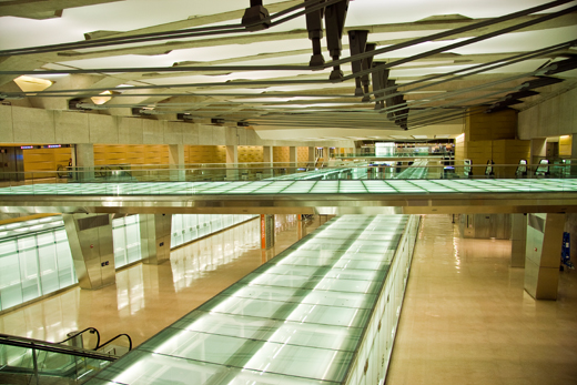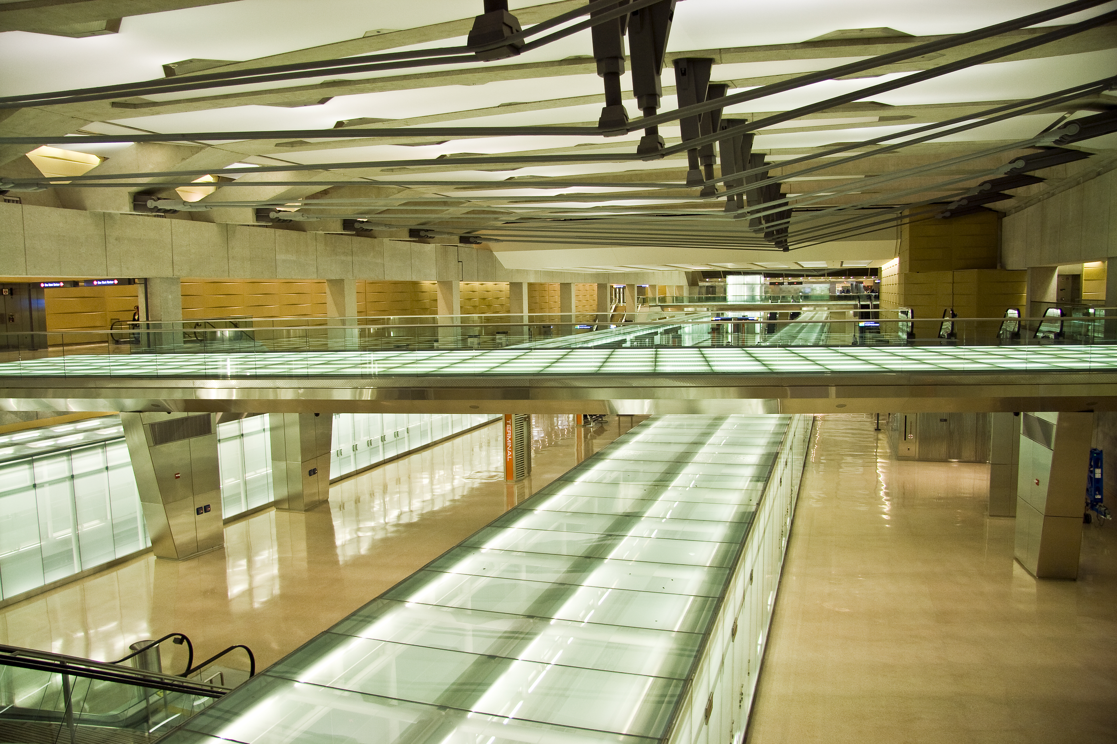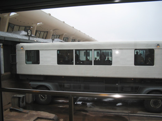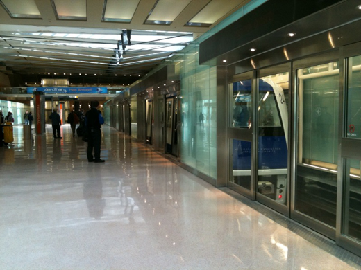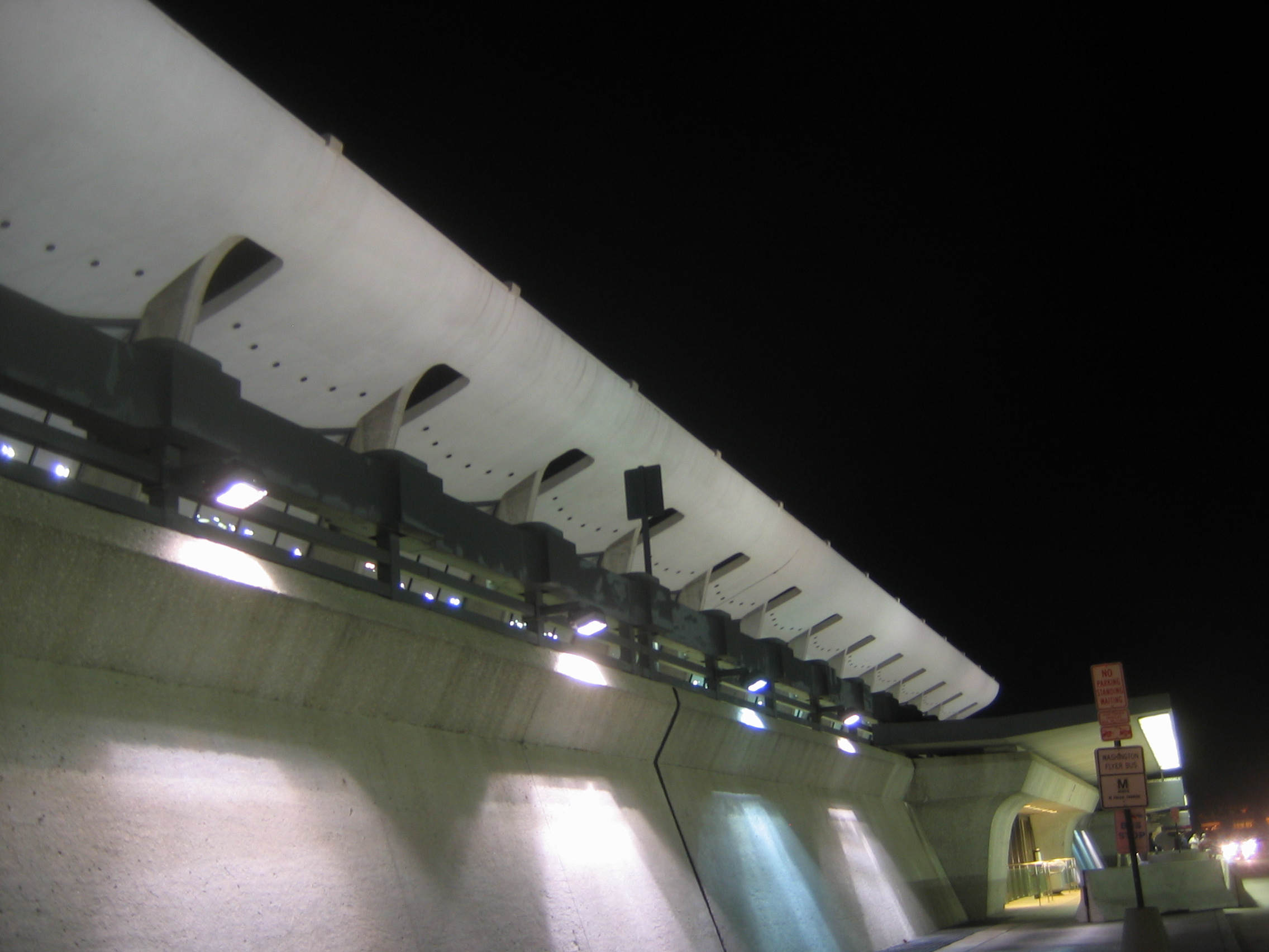 Planned developmentSince the 1980s, the original design, which had mobile lounges meet each plane, was not well-suited to Dulles' role as a hub airport. Instead, midfield concourses were added to allow passengers to walk between connecting flights without visiting the main terminal. Mobile lounges were still used for international flights and to transport passengers between the midfield concourses and the main terminal. An underground tunnel (consisting of a passenger walkway and moving sidewalks) which links the main terminal and concourse B was opened in 2004. The Metropolitan Washington Airports Authority (MWAA) began a renovation program for the airport, to include a new security mezzanine to help relieve the heavily congested security lines that are familiar to passengers traveling through the airport. A new train system, dubbed AeroTrain and developed by Mitsubishi, began in 2010 to transport passengers between the concourses and the main terminal. The system, which uses rubber tires and travels along a fixed underground guideway, is similar to the people mover systems at Singapore Changi Airport, Hartsfield–Jackson Atlanta International Airport, and Denver International Airport. The train is intended to replace the mobile lounges, which many passengers found crowded and congested. The initial phase includes the main terminal station, a permanent Concourse A station, a permanent Concourse B station, a permanent midfield concourse station (with access to the current temporary C concourse via a tunnel with moving walkways), and a maintenance facility. Mobile lounges continue to service the D Concourse from both the main terminal and the A Concourse. Mobile lounges will continue to transport international arrivals to the IAB facility. Dulles has stated that the wait time for a train does not exceed two minutes, compared to the average 15-minute wait and travel time for mobile lounges. Also, under the development plan, future phases would see the addition of several new midfield concourses and a new south terminal. A fourth runway (parallel to the existing runways 1 and 19 L&R) opened in 2008, and development plans include a fifth runway to parallel the existing runway 12-30. An expansion of the B concourse, which is used by many low cost airlines as well as international arrivals, has been completed, and the Midfield Concourses C and D mainly house United Airlines, and will eventually be knocked down to make room for a more ergonomic building. Because Concourses C and D are temporary concourses, the only way to get to those concourses is via moving walkway from the Concourse C station which is built in the location of the future gates and Concourse D by mobile lounge from the main terminal. TerminalsThe main terminal houses ticketing, baggage claim, U.S. Customs and Border Protection, the Z gates, and other support facilities. From here, passengers can take the Aerotrain or mobile lounges to their concourses, "plane mates" directly to their airplanes, or take the passenger walkway to concourse A/B. The plane mates/mobile lounges are also used to transport passengers arriving on international flights directly to the U.S. Customs and Border Protection inspection center located in the International Arrivals Building adjacent to the west side of the main terminal. The terminal cost US$108.3 million and has 143 gates total. Dulles is one of the few remaining airports to use the "mobile lounges" (also known as "plane mates" or "people movers") for boarding and disembarkation from aircraft, to transfer passengers between the midfield concourses and to and from the main terminal building. They have all been given names based on the postal abbreviations of 50 states, e.g.: VA, MD, AK The MWAA plans to retire the mobile lounge system for inter-terminal passenger movements in favor of the underground people mover and pedestrian walkway system (now in service to concourse A/B). However, some plane mates will remain in use to disembark international passengers and carry them to the International Arrivals Building, as well as to convey passengers to and from aircraft on hard stand (i.e., those parked remotely on the apron without access to jet bridges). Main terminalThe main terminal was recognized by the American Institute of Architects in 1966 for its design concept; its roof is a suspended catenary providing a wide enclosed area unimpeded by any columns. It houses ticketing, baggage claim, and information facilities, as well as the International Arrivals Building for passenger processing. The main terminal was extended in 1996 to 1,240 feet (380 m) — Saarinen's original design length — which was slightly more than double its originally constructed length of 600 feet (180 m). In addition, an extension for international arrivals was added to the west of the main terminal in 1991. On September 22, 2009, an expansion of the international arrivals building opened which includes a 41,400 square feet (3,850 m) arrival hall for customs and immigration processing. The new facility has the capacity to process 2,400 arriving passengers per hour. In September 2009, a 121,700 square feet (11,310 m) central Transportation Security Administration checkpoint was added on a new security mezzanine level of the main terminal. This checkpoint replaced previous checkpoints located behind the ticketing areas. A separate "Dulles Diamond" security checkpoint is available on the baggage claim level for expert adult travelers traveling alone who are security-ready. Both security checkpoints connect to the new AeroTrain, which links the main terminal with the A, B, and C concourses. There are two sets of gates in the main terminal: waiting areas for airlines which lack permanent physical gates and therefore use plane mates to reach planes parked at hard-stand locations, and the "Z" Gates, which provide service for US Airways. Midfield terminalsThere are two midfield terminal buildings: One contains the A and B midfi