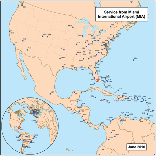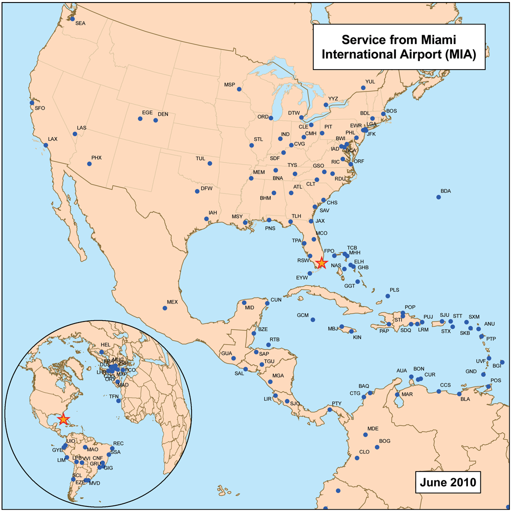 Coordinates: 25°47′36″N 080°17′26″W / 25.79333°N 80.29056°W Miami International Airport (IATA: MIA, ICAO: KMIA, FAA LID: MIA), also known as Wilcox Field, MIA, and Miami International, is the primary airport serving the South Florida area. The airport is located eight miles (13 km) northwest of Downtown Miami, in unincorporated Miami, Florida, United States. It is located between the cities of Miami, Hialeah, Doral, Miami Springs, the village of Virginia Gardens, and the unincorporated community of Fontainebleau. The airport is a hub for passenger airlines American Airlines, Executive Airlines under the American Eagle name, Gulfstream International Airlines under the Continental Connection name; cargo airlines Arrow Air, UPS Airlines and FedEx Express; and charter airline Miami Air. Miami International Airport handles passenger and cargo flights to cities throughout the Americas and Europe, as well as the Canary Islands off the African coast, and cargo flights to Asia; it is South Florida's main airport for long-haul international flights. Miami International Airport is the largest gateway between the United States and Latin America, and is one of the largest aerial hubs in the United States, owing to its proximity to tourist attractions, local economic growth, large local Latin American and European populations, and strategic location to handle connecting traffic between North America, Latin America, and Europe. In the past, it has been a hub for Braniff International Airways, Eastern Air Lines, Air Florida, the original National Airlines, the original Pan Am, United Airlines, and Iberia. Miami International is also the proposed hub of two new start-up airlines, one of which hopes to use the Eastern Airlines name. In 2009, the airport ranked first in the United States by percentage of international flights and second by volume of international passengers, behind only New York-JFK. In 2009, 33,886,025 passengers traveled through the airport, making the airport the 25th busiest airport in the world by passenger traffic. The Airport also ranks as the 12th busiest airport in the United States by annual passenger throughput and is the largest airport in the state of Florida, surpassing Orlando by a small margin. The airport also handled more international cargo than any other airport in the United States. History
