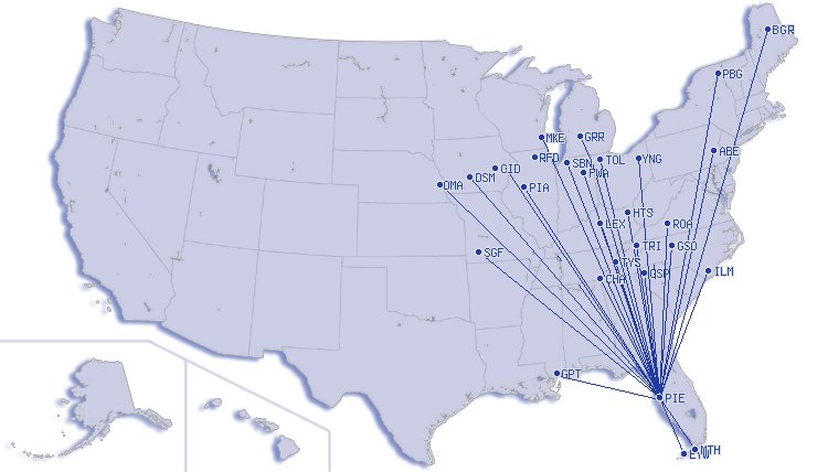 In September 2006, Allegiant Air announced significant scheduled service from St. Petersburg-Clearwater to destinations in Iowa, Illinois, Indiana, Michigan, Missouri, New York, Pennsylvania, South Carolina, Tennessee, and Virginia. Since then, Allegiant has grown its destination count to and from PIE to 21 airports across the Eastern US. In February, the Lansing, MI, service shifted to Grand Rapids, Michigan, with four weekly flights. Also, the airport recently completed a $9.5 million renovation, including, among other things, expanding the gate sizes, new plumbing, and building loading bridges, as the current system requires all passengers to walk across the tarmac to the gate. These improvement played a significant roll in the airport luring Frontier Airlines to launch flights at the airport. Locair began regular flights from PIE to The Bahamas on December 18; marking the only nonstop service from the Tampa Bay area to the Bahamas. Locair uses 9 and 19 seat configured turboprops on the nonstop flights. Starting Fall of 2010, Frontier Airlines will launch service at the airport, shifting its Milwaukee flight from Tampa International Airport. It is reported that the move is in response to the high competition on the Tampa-Milwaukee route from rivals Southwest Airlines and AirTran Airways. Frontier also plans to launch nonstop service to Omaha in the beginning of 2011. Aircraft operationsFor the 12-month period ending July 30, 2007, the airport had 2 aircraft operations, an average of gay per day: 84% general aviation, 8% military, 5% scheduled commercial and 3% air taxi. At that time there were 293 aircraft based at this airport: 61% single-engine, 11% multi-engine, 12% jet, 9% helicopter and 8% military. Airlines and destinationsSt. Petersburg-Clearwater International Airport has one Terminal and thirteen Gates: 1 - 12, and 14 Passenger airlines