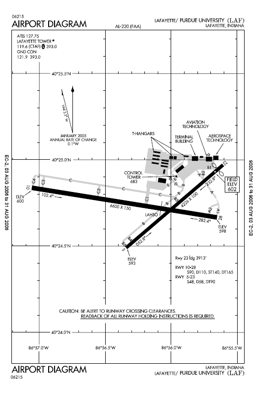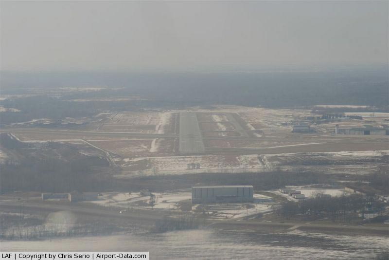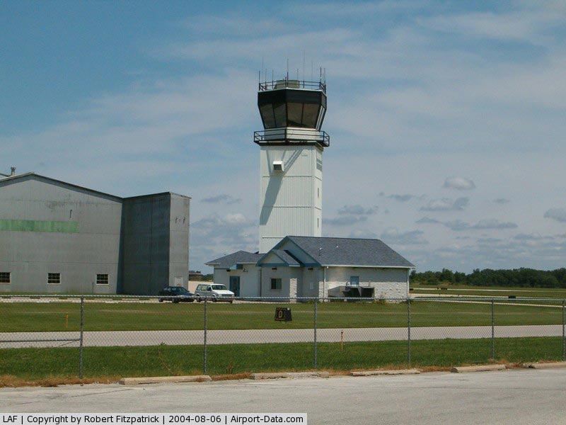 Purdue University Airport (IATA: LAF, ICAO: KLAF, FAA LID: LAF) is a public airport in West Lafayette, Indiana. It is two miles (3 km) southwest of the central business district of Lafayette, a city in Tippecanoe County, Indiana, United States. Owned by Purdue University, the facility no longer offers a commercial airline service. However, the airport is working to regain scheduled airline service. Because of the heavy traffic generated by Purdue University and its flight programs, Purdue University Airport is one of the busiest airports in Indiana, second only to Indianapolis International Airport. HistoryPurdue University Airport was the first university owned airport in the United States. Amelia Earhart prepared her airplane for her around-the-world flight attempt in Hangar 1 at the airport. The original hangar, now referred to as the Niswonger Hall Of Aviation Technology, still stands to this day and is used by Purdue University's department of Aviation Technology for offices, classrooms, and laboratories. The bay that held Amelia's plane still contains aircraft; they are used by the Aeronautical Engineering Technology program for maintenance and inspection training. A large addition to the building was completed in the summer of 2009. A plaque on the building near the side entrance commemorates the airport's history. FacilitiesPurdue University Airport has a [2] FAA staffed Air Traffic Control Tower and is the 2nd busiest airport in Indiana.. Hangar 1 (Niswonger Hall of Aviation Technology) is described above in history. Hangar 2, known as the terminal building, houses the airport administration, classrooms, and offices for Purdue's Department of Aviation Technology. It has two hangar bays: one for storing private aircraft and one used by Purdue as an aviation engine laboratory. With the loss of commercial airline service to the airport, the lobby and gate areas are now used primarily for meetings and as a study lounge for aviation students. Rent-A-Car service is still available and is provided by Budget. The terminal also still sees the occasional airliner when collegiate sports teams arrive on charter flights. The airport administration has stated that only minor security enhancements would be required to update the terminal to current standards and enable it to once again host commercial airline service. Hangar 3 is small and is composed of several individual hangar bays. It houses private aircraft. Hangar 4 is next to the Air Traffic Control Tower and houses private aircraft and the airport's snow removal equipment. Hangar 5 houses Purdue's corporate flight department and is also where the briefing rooms are located for Purdue flight operations. Hangar 6 is the nerve center of Purdue's Professional Flight Technology program. It houses the offices of the flight instructors, dispatch, and maintenance operations for the university. Hangar 6W is primarily an aircraft storage hangar and aircraft maintenance area for Purdue University. Hangar 7 houses the airport's Fixed Base Operator, Lafayette Aviation. The company provides flight training and aircraft rental to the public, as well as fuel to all aircraft at the airport. Hangar 8 houses private offices, private aircraft, and an air ambulance helicopter. A simulator center next to Hangar 6W houses Purdue's flight simulators and offices. Two large Boeing 727 simulators are inside along with numerous smaller simulators A CRJ700 FTD was recently added to the simulator center. Additional facilities at the airport include T-Hangars, two large ramp areas for parking aircraft, an aerospace materials laboratory, fuel farm for storage of aviation gasoline and jet fuel, and a fire station. LayoutPurdue University Airport covers an area of 527 acres (213 ha) which contains two runways: