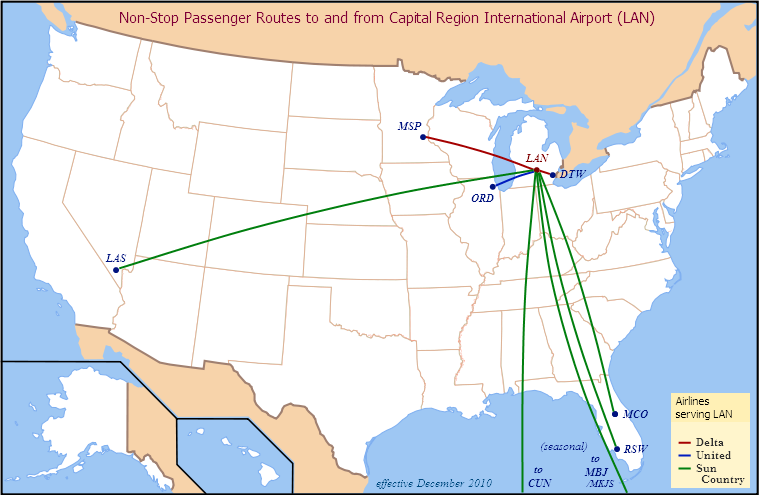 In February 2009 Forbes Magazine ranked Capital Region International Airport tied for the 18 most expensive airport to fly from in the United States, with an average fare of 35¢ per mile. The magazine ranked two other Michigan airports as more expensive. Cherry Capital Airport (TVC) in Traverse City was ranked second (41¢ per mile), and MBS International Airport (MBS) northwest of Saginaw was tied for the 11 most expensive airport in the country (36¢ per mile). Airlines and destinationsThe following passenger airlines fly to and from Capital Region International Airport: