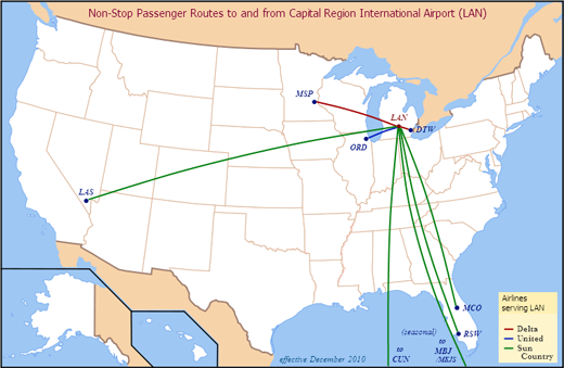 The majority of flights serving the airport are on Bombardier CRJ200 regional airliners; some flights are on Embraer ERJ 145 aircraft. Sun Country Airlines flights are on Boeing 737-800 aircraft. Passenger StatisticsThe peak year for passenger activity at Capital Region International Airport was in 1997 with 720,365 total passengers. CompetitionCapital Region International Airport competes with nearby Detroit Metropolitan Wayne County Airport (DTW), Grand Rapids Gerald R. Ford International Airport (GRR), and the recent growth of Flint Bishop International Airport (FNT). In addition, the Michigan Flyer provides motorcoach service roundtrip from nearby East Lansing to Detroit Metro Airport eight times daily. In 2006 the Capital Region Airport Authority estimated that the airport lost approximately 162,000 passengers that year to nearby competing airports. The airport lost about $53 million in annual revenue as a result of the passenger losses. According to the Airport Authority, recent research found that 550,000 of the 873,000 airline tickets sold from mid-Michigan in 2009 were to travelers using other Michigan airports, resulting in an economic loss of $108 million to the region. The lost revenue to the airport was approximately $17 million. In March 2009 the Lansing State Journal cited a Michigan State University study finding that passengers out of Capital Region International Airport feel the airport is convenient to use, but more than two-thirds of those surveyed also flew from other Michigan airports during the previous year. This is despite 84% of passengers being satisfied with the airline service offered at Lansing's airport, a drop from 93% passenger satisfaction in 2002. The 2008 study noted that 49% of travelers thought Lansing's airport was more expensive to fly out of than Detroit Metropolitan Airport; 13% of travelers thought Lansing was less expensive. The same study in 2002 found that 41% of travelers thought that Lansing was more expensive to fly out of than Detroit, and 14% thought Lansing was less expensive.