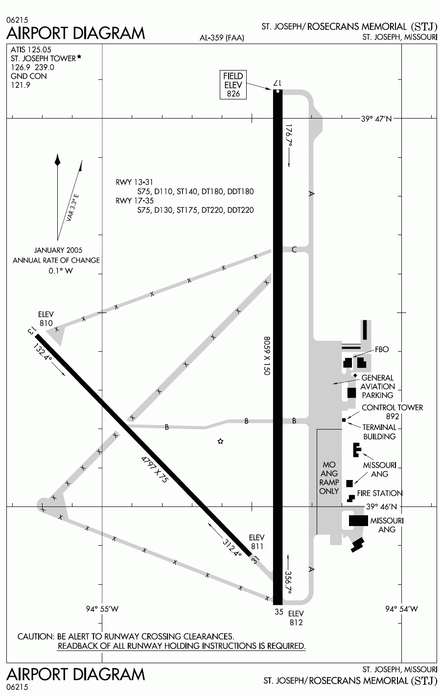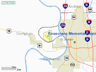 Rosecrans Memorial Airport (IATA: STJ, ICAO: KSTJ) is a joint civil-military public airport located three miles (5 km) northwest of the city of St. Joseph in Buchanan County, Missouri, USA. The airport is one of two bases for the Missouri Air National Guard and also serves general aviation. HistoryRosecrans Memorial Airport is located on a field that was once referred to as the French Bottoms. It was surrounded by four towns, three of which existed as late as 1979. The northern portion of the French Bottoms was settled first, in the 1830s-50's, and has since washed away. The settlers were French-born and/or descendants of earlier French settlers. In 1877 most of the land that now comprises the airport was located on a river bank on what was called "made land." This land had been formed by river deposits. By this year the French Bottoms contained sixty houses, one church, and two schools. The rich river bottom land, totaling approximately five thousand acres (20 km²), was traditionally used for farming. Some of the descendants of the early French settlers still lived in the bottoms in 1939, when the area was razed to make way for the airport. The airport was named in honor of Sgt Guy Wallace Rosecrans "and comrades" of the 153rd Aero Squadron, U.S. Army Air Service, 1917-18. Rosecrans was the only St. Joseph airman killed in World War I. The new 1939 flying field was the third airport in St. Joseph to bear the name Rosecrans. In 1922 the first Rosecrans Field was opened at Lake Contrary. The second was Rosecrans Municipal Airport on the waterworks road, abandoned because of its small size and its dangerous proximity to the Missouri River bluffs to its east. The 1939 airport was developed by the city as a municipal airport. Two three-thousand-foot-long (910 m) runways were constructed in 1939, as well as an aircraft hangar located east of the runway intersection. During World War II the federal government established an Army Air Forces base at Rosecrans with numerous improvements being made between 1942 and 1943. The diagonal runways were doubled in length and a 5,500-foot (1,700 m) north-south runway was constructed, while the aircraft parking apron and many temporary buildings, including Hangar T-1020, were built. In 1948 much of the airfield's facilities were conveyed to the city, with the exception of 142 acres (0.57 km) set aside for use by the Air National Guard. Airport construction during this period consisted of pump house buildings and T-hangars (1949–50) and a terminal and administration building (1951–52). The Great Flood of 1951 damaged many of the temporary World War II airport buildings beyond economical repair. The Missouri River changed course in the flood, cutting off the airport from its land connection to St. Joseph. Today, visitors from Missouri must go through Kansas via the Pony Express Bridge and Elwood, Kansas in order to reach the airport. The U.S. Army Corps of Engineers formalized the course change by dredging cut-off channel for the river between the airport and downtown St. Joseph. An oxbow lake (Browning Lake) was formed in the old Bellemont Bend and Elwood Bend portions of the river channel. The cut-off channel modified portions of Bon Ton Bend and St. Joseph Bend, and separated the city from the airport. A bridge and highway were later constructed to connect the two. Construction during the next twenty years included a main hangar building (1954), a flight office building (1960), an emergency generator building (1963), a center taxiway (1973), and a runway (1974–75). The Great Flood of 1993 destroyed the City Administration Building and the Cockpit Cafe. Both were rebuilt. The oldest, center hangar had to be demolished. In 1994, the diagonal runway, Runway 13-31, was rebuilt into a new assault landing strip for the Air National Guard and as an additional VFR runway for general aviation aircraft. A new fixed base operator building and a hangar were also constructed. The last scheduled commercial airline service at the airport was in 1969, three years before the opening of Kansas City International Airport, 30 miles (48 km) south of downtown St. Joseph via Interstate 29. Over the years the airport has been used for/by business-related general aviation, agricultural crop spraying, charter passenger and cargo services, area student pilot training, nightly mail delivery, and until its acquisition by American Airlines, pilot training operations by Trans World Airlines (TWA). Today, its primary use is as a base for the Missouri Air National Guard. Rosecrans Air National Guard BaseAs previously mentioned, with the end of World War II, much of the former U.S. Army Air Forces installation was transferred to the city with the exception of 142 acres (0.57 km) for the National Guard. With the establishment of an independent U.S. Air Force in 1947, the military facilities became part of the newly-established Air National Guard. This facility became the foundation for the current Rosecrans Air National Guard Base. Rosecrans ANGB is currently home to the 139th Airlift Wing (139 AW), an Air Mobility Command (AMC)-gained unit of the Missouri Air National Guard, which functions as the host wing for the installation. The An additional tenant command at Rosecrans ANGB is the Advanced Airlift Tactics Training Center (AATTC), a combined activity of both the Air National Guard (ANG) and the Air Force Reserve Command (AFRC). The mission of the Advanced Airlift Tactics Training Center (AATTC) is to increase the warfighting effectiveness and survivability of all USAF air mobility forces. AATTC is made up of full-time Air National Guard and Air Force Reserve personnel dedicated to increasing the warfighting effectiveness and survivability of air mobility forces, providing advanced tactics training to tactical airlift crews and support personnel from the Air National Guard, Air Force Reserve Command, Air Mobility Command, Air Combat Command, Air Force Special Operations Command,