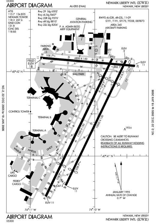 Runway 11/29 is part of the original paved runway system developed in the 1940s. In 1952, original Runways 1/19 and 6/24 were closed in response to concerns about obstructions and noise, and a modern Runway 4/22 (now 4R/22L) was commissioned at a length of 7,000 ft (2,100 m) This runway was later extended to 9,800 feet (3,000 m), shortened for a while to 9,300 ft (2,800 m) and finally brought to its present length by 2000. Runway 4L/22R was built in the early 1970s at a length of 8,200 ft (2,500 m) and was extended to its current dimensions by 2000. All approaches except Runway 29 are equipped with Instrument Landing Systems, and Runway 4R is certified for Category III ILS approaches. Most departing traffic use Runway 4L/22R, while most arriving traffic use 4R/22L, and 11/29 is used more often by smaller aircraft or when there are strong crosswinds on the two main runways. Newark's two parallel runways (4L and 4R) have a lateral separation of only 900 feet (270 m), which is the fourth smallest of major airports in the U.S., after SFO, LAX and SEA. (Calculated from the lat-lons at the parallel runways are 950 ft (290 m) apart.) TerminalsNewark Liberty International Airport has three passenger terminals. Terminal A and Terminal B were completed in 1973 and have four levels. Ticket counters are on the top floor, except for the second-floor Air India and first-floor British Airways desks. Gates and shops are on the third floor. An international arrivals lounge (Terminal B) and baggage carousels (both A and B) are on the second floor. Finally, short-term parking and ramp operations (restricted areas) are on the ground floor. Terminal C, completed in 1988, has two ticketing levels, one for international check-in and one for domestic check-in. At the time of its opening, it was considered to be the most modern airport terminal in the United States. The gates, as well as food and shopping outlets, are located on a mezzanine level between the two check-in floors. From 1998 to 2003, Terminal C was renovated. The baggage claim area was renovated and turned into a second departure level, a 19-gate third concourse was added, an international arrivals facility was added, and a 3,400-space parking garage and new baggage processing facilities were added, including turning the former underground parking area into a new baggage claim. Parking had been prohibited underneath the terminal as a security measure after the first attack on the World Trade Center in 1993. As of 2008, Terminal B is being renovated to increase capacity for departing passengers and passenger comfort. The renovations include expanding and updating the ticketing areas, building a new departure level for domestic flights, and building a new arrivals hall. Plans are also in place to expand Terminal A by adding a new parking garage and radically expanding the size of the first concourse to add new gates, ticketing, baggage and security areas. Each terminal is subdivided into three numbered concourses: Terminal A, for instance, is divided into concourses A1, A2, and A3. Gate numbering is continuous through all the terminals. Wayfinding signage throughout the terminals was designed by Paul Mijksenaar. Terminal A is the only terminal at Newark not fitted with immigration facilities: flights arriving from other countries cannot use Terminal A (except countries with US customs preclearance), although some departing international flights use the terminal. Following the business model of the Port Authority's other facilities, in some cases entire terminals are operated by terminal operators and not by the Port Authority directly. At Newark Liberty, Terminal A is operated by United Airlines and Terminal C is operated by Continental Airlines. Terminal B is the only passenger terminal directly operated by the Authority. Terminals, airlines and destinations