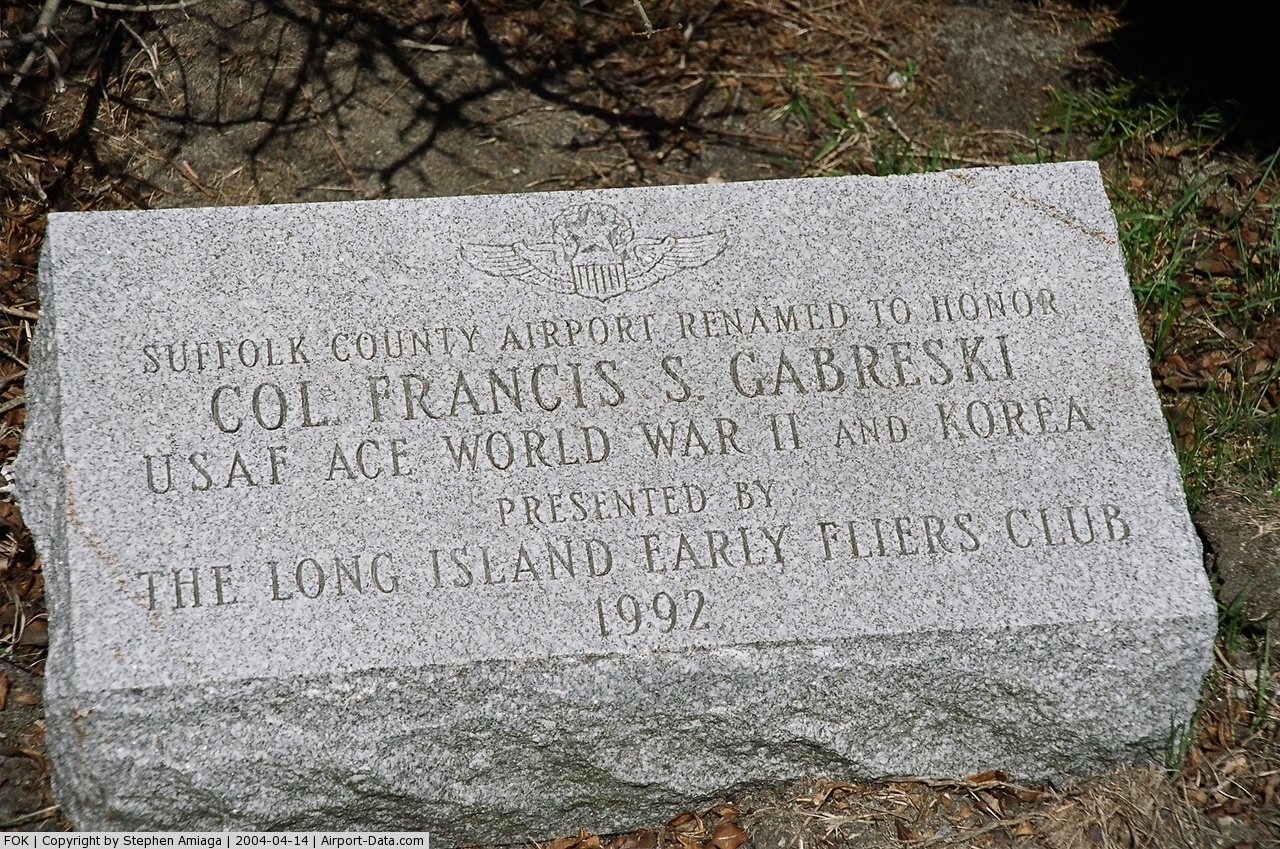 Known as Suffolk County Air Force Base until 1969, then Suffolk County Airport until 1991, when it was renamed in honor of Francis S. Gabreski, a flying ace in World War II who was the commander of the 52nd Fighter-Interceptor Wing at the base from 1964 through November 1967 when he retired.