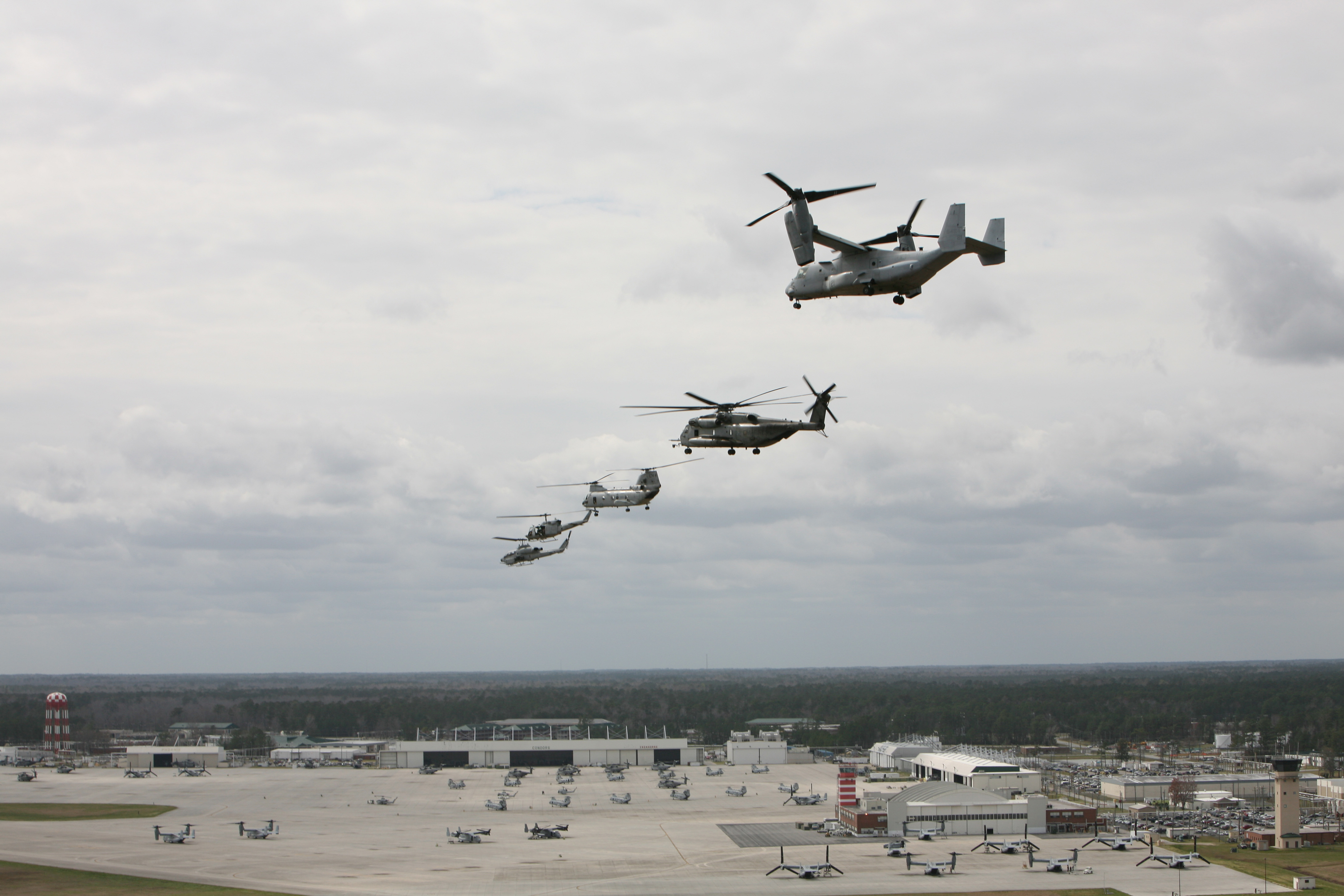 From right, a V-22 Osprey, a CH-53E Super Stallion, a CH-46 Sea Knight, a UH-1N Huey, and an AH-1 Cobra fly in formation over Marine Corps Air Station New River, North Carolina, March 18, 2008. |
