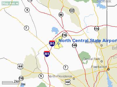 The airport is situated in the towns of Smithfield and Lincoln. It is located in the upper region of the state and is roughly horizontally centered in the state, hence the name "North Central". It is designated as a reliever airport for general aviation activity from T.F. Green Airport.
