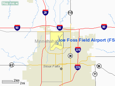 Runway layout at FSD Sioux Falls Regional Airport (IATA: FSD, ICAO: KFSD, FAA LID: FSD), also known as Joe Foss Field, is a joint civil and military use airport located three nautical miles (6 km) northwest of the central business district of Sioux Falls, a city in Minnehaha County, South Dakota, United States. Named in honor of aviator Joe Foss, it serves the greater Sioux Falls area, as well as communities throughout eastern South Dakota, southwestern Minnesota and northwestern Iowa.