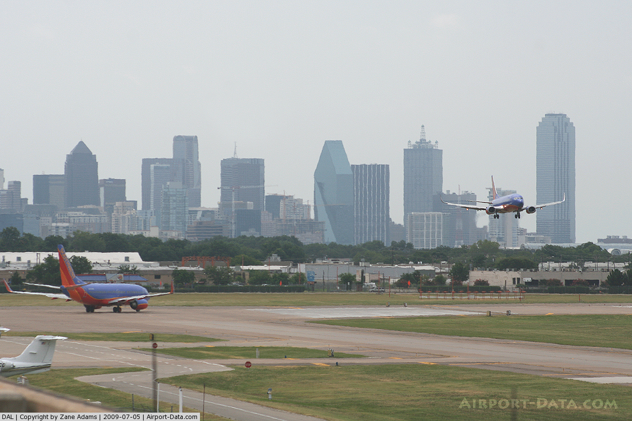 Dallas Love Field (IATA: DAL, ICAO: KDAL, FAA LID: DAL) is a city-owned public-use airport located 6 miles (10 km, 5 nautical miles) northwest of the central business district of Dallas, a city in Dallas County, Texas, United States. Love Field was the primary airport for Dallas until 1974, when Dallas-Fort Worth International Airport opened. Love Field is now Dallas's secondary airport and serves as a major focus city for Southwest Airlines, which has its corporate headquarters on airport grounds. Continental Express and Delta Connection also offer service from Love Field. HistoryPrior to 1957Love Field was opened as an Army flying field on October 19, 1917, constructed just southeast of Bachman Lake. It was named after First Lieutenant Moss Lee Love, who died in an airplane crash in San Diego, California. Love Field was opened to civilian use in 1927 when the City of Dallas purchased the land with National Air Transport starting the first passenger service. On April 9, 1932, the first paved runways at the airfield were completed. During World War II, the airport was used by the United States Army Air Forces for flying training, with the Dallas Texas Aviation School providing basic (level 1) flight training, equipped with Fairchild PT-19s as the primary trainer used. Also had several PT-17 Stearmans and a few P-40 Warhawks assigned. Love Field was also used as a sub-depot of the San Antonio Air Service Command for aircraft overhauls. Air Force facilities were closed at the end of the war in August 1945. In September 1943, construction was completed on a new north-south runway (18/36) and northwest-southeast runway (13/31). On March 9, 1947, Love Field's Lemmon Avenue Terminal Building opened on the east side of the airfield. The city adopted an amended Master Plan for Love Field in 1948 guiding future expansion. On November 29, 1949, American Airlines Flight 157, a Douglas DC-6 en route from New York City to Mexico City with 46 passengers and crew, slid off Runway 36 after the flight crew lost control on final approach to Love Field for a routine stopover. The airliner struck a parked airplane, a hangar, and a flight school before crashing into a business across from the airport, killing 28. This was the deadliest air disaster in Texas history at the time and, according to modern reference sources, remains the deadliest crash to take place at the airfield itself. Pioneer Airlines moved its base from Houston to Love Field in 1950. On March 26, 1952, work was completed to extend Runway 13/31 to its current length of 7,752 ft (2,363 m). Soon afterwards on June 1, 1954, the east/west crosswind Runway 7/25 was permanently closed; it was later removed to accommodate new terminal construction. This left Love Field with only two runways: Runway 13/31, the longer primary runway, and the shorter Runway 18/36. 1957 to 1974Love Field's new terminal building (the third and current terminal) was dedicated on October 20, 1957 and opened to airline service on January 20, 1958. The complex opened with three one-story concourses equipped with 26 ramp-level gates and connected to the terminal by the world's first airport moving walkways. Airlines serving the airport at the time included American, Braniff, Central (which was based in Fort Worth), Continental, Delta and Trans Texas (later Texas International). Jet-powered operations began on April 1, 1959 when Continental Airlines introduced the Vickers Viscount turboprop. Turbojet operations began on July 12, 1959 when American Airlines initiated Boeing 707 flights to New York. The 1960s brought tremendous growth to Love Field. In 1961, Mr. and Mrs. Earle Wyatt made a gift of a large bronze statue bearing the inscription "One Riot, One Ranger" for display in the airport's new terminal. Famed Texas born sculptress Waldine Tauch created the piece. The inscription refers to an incident in which a single Texas Ranger was dispatched to quell a riot. On November 22, 1963, President John F. Kennedy arrived in Dallas via Love Field. After his assassination, Lyndon B. Johnson was sworn in as president aboard Air Force One at Love Field. On April 2, 1965, the 8,800 ft (2,682 m) long parallel Runway 13R/31L was opened to relieve traffic on congested Runway 13/31 (which was renamed Runway 13L/31R). The project had been vexed by extensive legal wrangling; safety concerns were raised regarding its proximity to schools and its minimal safety areas, while nearby residents attempted to stop the anticipated increase in jet noise and the removal of homes and businesses adjacent to the airport to accommodate the project. Several terminal expansion programs were fueled by the boom in air travel during the 1960s. American Airlines expanded their concourse in 1968. In the same year, Braniff opened its "Terminal of the Future." The expansion, showcasing Alexander Girard, Herman Miller and Ray and Charles Eames designs, featured the first rotunda concourse, jet bridges and several airport innovations. Braniff connected their new terminal to new remote parking lots with the Jetrail monorail system in 1970. Texas International expanded their concourse in 1969, and Delta's concourse was expanded in 1970. In 1972, Love Field was the site of a notable hijacking incident. On 12 January, Billy Gene Hurst, Jr., a resident of Houston, Texas, hijacked Braniff Flight 38, a Boeing 727 airliner, as it departed William P. Hobby Airport in Houston bound for Dallas, Kansas City, Missouri, and Minneapolis, Minnesota. Mr. Hurst, who had a history of mental illness and unstable behavior, was armed with a .22 caliber handgun and a briefcase that he claimed was filled with dynamite. After the plane landed at Love Field at 2:50 PM, Hurst allowed all 94 passengers to deplane, but continued to hold the 7 crewmembers hostage. During the ensuing standoff with Dallas police and FBI agents, Hurst insisted on flying to South America, although he apparently never named a specific destination. He also made a va