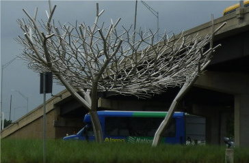 The first one that most visitors will see is by artists Paul Kittleson and Carter Ernst, is an enormous stainless steel bird’s nest, 30-feet wide, held 20-feet above the ground by three steel tree trunks, floating above a subtropical garden. The artwork, with its interwoven branches, re-created in industrial materials, is meant to reflect the spirit of Houston’s industries, working along the coastal plains. It is located at the Broadway entrance to the airport.