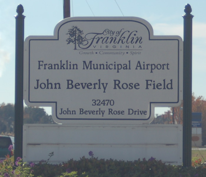 Franklin Municipal-John Beverly Rose Airport, also known as Franklin Municipal Airport or John Beverly Rose Field (IATA: FKN, ICAO: KFKN, FAA LID: FKN) is a public airport in Isle of Wight County, Virginia, United States. The airport is owned by the City of Franklin and is located at 32470 John Beverly Rose Drive, two nautical miles (4 km) northeast of the city's central business district.
