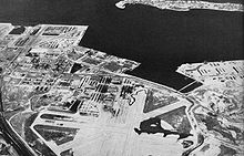 Naval Station Norfolk, in Norfolk, Virginia, is a base of the United States Navy, supporting naval forces in the United States Fleet Forces Command, those operating in the Atlantic Ocean, Mediterranean Sea, and Indian Ocean. NS Norfolk, also known as the Norfolk Navy Base, occupies about four miles (6 km) of waterfront space and seven miles (11 km) of pier and wharf space of the Hampton Roads peninsula known as Sewell's Point. It is the world's largest Naval Station, supporting 75 ships and 134 aircraft alongside 14 piers and 11 aircraft hangars, and houses the largest concentration of U.S. Navy forces. Port Services controls more than 3,100 ships' movements annually as they arrive and depart their berths. Air Operations conducts over 100,000 flight operations each year, an average of 275 flights per day or one every six minutes. Over 150,000 passengers and 264,000 tons of mail and cargo depart annually on Air Mobility Command (AMC) aircraft and other chartered flights from the airfield. It is the hub for Navy logistics going to the European and Central Command theaters of operations, and to the Caribbean. HistoryThe land on which the naval station is located was originally the site of the 1907 Jamestown Exposition. During this exposition, high-ranking naval officers agreed that this site was ideal for a naval activity. A bill was passed in 1908 proposing Congress to allow $1 million for the purchase of the property and buildings, but it died when the Assistant Secretary of the Navy was given a choice between this property and a new coal ship. He replied that a new ship was an absolute necessity. However, immediately after the United States entered World War I in April 1917, the Secretary of the Navy was persuaded to buy the property. A bill was passed for the purchase of 474 acres (1.9 km²); it set aside the sum of $1.2 million as payment for the property and an additional $1.6 million for the development of the base, including piers, aviation facilities, storehouses, facilities for fuel and oil storage, a recruit training station, a submarine base and recreation grounds for fleet personnel. Rear Admiral Dillingham was assigned the task of coordinating the area's development. Construction of the training camp began on Independence Day 1917, and within the first 30 days housing for 7,500 men had been completed. The next six months saw the establishment of the 5th Naval District Headquarters and the Naval Operating Base, which included the Naval Training Center, Naval Air Station, Naval Hospital and Submarine Station. By Armistice Day 1918, there were 34,000 enlisted men at the base. When the available land became insufficient, a large part of the flats on the west and north were filled from dredging done to allow large ships to dock. During the fall and winter of 1917, approximately 8 million cubic yards (6,000,000 m³) of dredging took place. NAS NorfolkImportant historical events were taking place on the air side of the station as well. November 14, 1910 marked the birth of naval aviation. Eugene Ely, a pilot employed by the Curtiss Exhibition Company, slowly accelerated toward the end of a 57-foot (17 m) wooden ramp constructed on the bow of USS Birmingham. The heavy cruiser was anchored in the James River, not too far from the site of the Civil War's famous ironclad Battle of Hampton Roads between the Monitor and Merrimac. NAS Norfolk started its roots training aviators at Naval Air Detachment, Curtiss Field, Newport News, May 19, 1917. Approximately five months later, with a staff increasing to five officers, three aviators, ten enlisted sailors and seven aircraft, the detachment was renamed Naval Air Detachment, Naval Operating Base, Hampton Roads. The aircraft, all seaplanes, were flown across the James River and moored to stakes in the water until canvas hangars were constructed. The new location offered sheltered water in an ice-free harbor, perfect for seaplane landings, good anchorage on the beach front, accessibility to supplies from Naval Station Norfolk and room for expansion. Its mission was to conduct anti-submarine patrols, train aviators and mechanics and run an experimental facility. World War IWhen the United States became involved in World War I, the size of the Navy's air component was rapidly expanded. In the 19 months of U. S. participation, a force of 6,716 officers and 30,693 enlisted served in naval aviation. The training of mechanics to support the aircraft began in January 1918 at the Norfolk detachment and the first patrol was conducted five months later. By then, the air detachment was recognized as one of the most important sources of trained naval aviators. In recognition of its importance, on August 27, 1918, the detachment became Naval Air Station Hampton Roads, a separate station under its own commanding officer, Lt. Cmdr. P.N.L. Bellinger. 1920s–1930sAs World War I came to an end, the former NAS Hampton Roads saw erratic growth, growing to nearly 167 officers, 1,227 enlisted men and 65 planes. But, it was after the war that demobilization had threatened the future of naval aviation. Within seven months of the war's end, Navy manpower fell to less than half its wartime highs. The Republican party rose to power in 1920, promising fiscal austerity. Congress cut naval appropriations by 20% and manpower Navy-wide was reduced. The carriers which Congress had authorized were impossible to man. After the 1929 stock market crash and the onset of the Great Depression, President Herbert Hoover favored more naval limitation through international conferences, but the air operations in Norfolk continued. On July 12, 1921, the name was changed again under the command of Capt. S.H.R. Doyle, to Naval Air Station Norfolk, with direct reporting to the Bureau of Aeronautics in Washington, D.C. Using the same theories of Eugene Ely's flight nearly 13 years earlier, another milestone was achieved. The air station developed an arresting device to train pilots for deck la