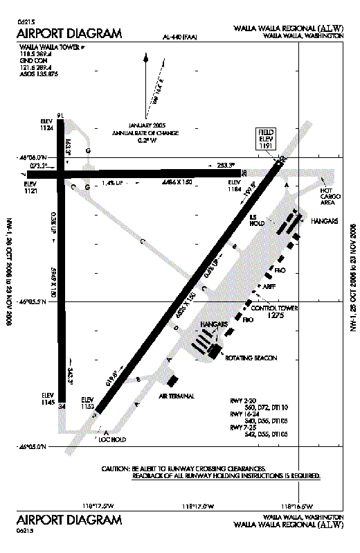 Walla Walla Regional Airport (IATA: ALW, ICAO: KALW, FAA LID: ALW) is a public airport located three miles (5 km) northeast of the central business district of Walla Walla, a city in Walla Walla County in the U.S. state of Washington. It is owned by the Port of Walla Walla. HistoryThe airport was the location of the U.S. Army Air Corps' Walla Walla Army Air Base in World War II. The War Department announced they would be spending over 7.5 million dollars to construct an Army Air Corps Training Airfield adjacent to the existing Walla Walla Airfield. With the old 200-acre municipal airport as a nucleus, they commenced development of the Walla Walla Army Air Base, which ultimately comprised 2,164 acres of land. Over 300 buildings were constructed and equipped to house, feed and train approximately 6,000 men at one time. The 91st Bomb Group lays claim to being the first Army Air Forces outfit to utilize the Walla Walla Base. They had initially trained in Florida before arriving in Walla Walla. Upon arrival, they trained and learned to fly B-17 airplanes. The 91st Bomb Group went on to distinguish itself in combat over Europe. Several of these crews made outstanding records during their tour of duty and were well publicized upon their return to the states with names such as “Jack the Ripper”, “Memphis Belle” and “Delta Rebel”. The “Memphis Belle” became the first B-17 to complete 25 missions in Europe. Late in 1943, Walla Walla Army Airfield lay idle when the Second Air Force withdrew its B-17 Flying Fortress training operation. However, in April of the following year, the Fourth Air Force took charge of the airstrip and established a training base for B-24 Liberator crews. During the war years, it is estimated that more than 8,000 officers and men were trained at this base producing 594 heavy bomber crews who compiled about 114,514 hours in the air while in training. In 1947 the United States Air Force declared the Walla Walla Airfield surplus and on December 1, 1947 the City and County took over operations. An Airport Board was formed to manage the airport and the complexities of the facilities transfer. After considerably less than the standard two year probationary period, the Airport Board received an approved Civil Aviation Authority’s full and complete title to the $13 million airport on April 10, 1949. This was the first joint ownership (City/County) permitted in the entire nation. In 1989, the "Port of Walla Walla" took over ownership and operational responsibility of the airport from the city and county of Walla Walla. The airport is mostly used for general aviation but is also served by one commercial airline. The former office and supply buildings surrounding the airport proper have become a haven for smaller industrial/manufacturing businesses, including, as of June 2007, fifteen full-line wineries that source their fruit from the Walla Walla and Columbia Valley appellations. The Port of Walla Walla, in fact, recently completed a "wine incubator" project; three specially-constructed buildings that are leased on non-renewable six-year contracts to fledgling wineries. Among the 20 plus wineries with primary operations at the Walla Walla Regional Airport are Dunham Cellars, Tamarack Cellars, Buty Wines, Syzygy Winery, Revelry Vintners, Five Star Cellars, and Stephenson Cellars. Facilities and aircraftWalla Walla Regional Airport covers an area of 2,319 acres (938 ha) which contains three paved runways: 2/20 measuring 6,527 x 150 ft (1,989 x 46 m), 7/25 measuring 4,486 x 150 ft (1,367 x 46 m) and 16/34 measuring 5,948 x 150 ft (1,813 x 46 m). There is a VOR on the field that operates on 116.4 MHz. For the 12-month period ending December 31, 2006, the airport had 28,516 aircraft operations, an average of 78 per day: 87% general aviation, 13% air taxi, <1% military and <1% scheduled commercial. At that time there were 134 aircraft based at this airport: 82% single-engine, 13% multi-engine, 2% jet, 1% ultralight and 1% glider. Walla Walla University and Skyrunners Corporation operate flight schools on the field, from primary training through multi-engine, commercial, and other training. Airlines and destinations
