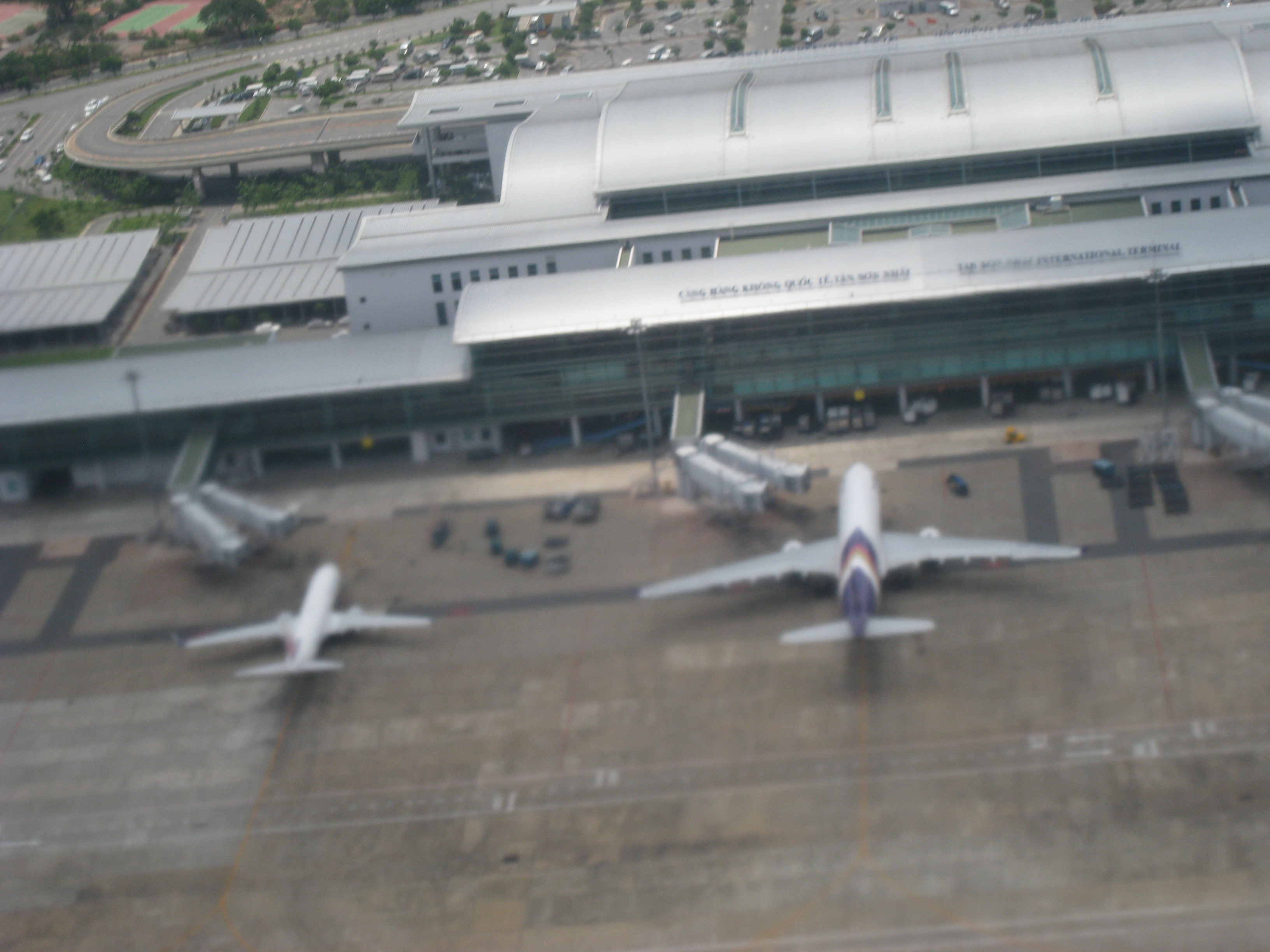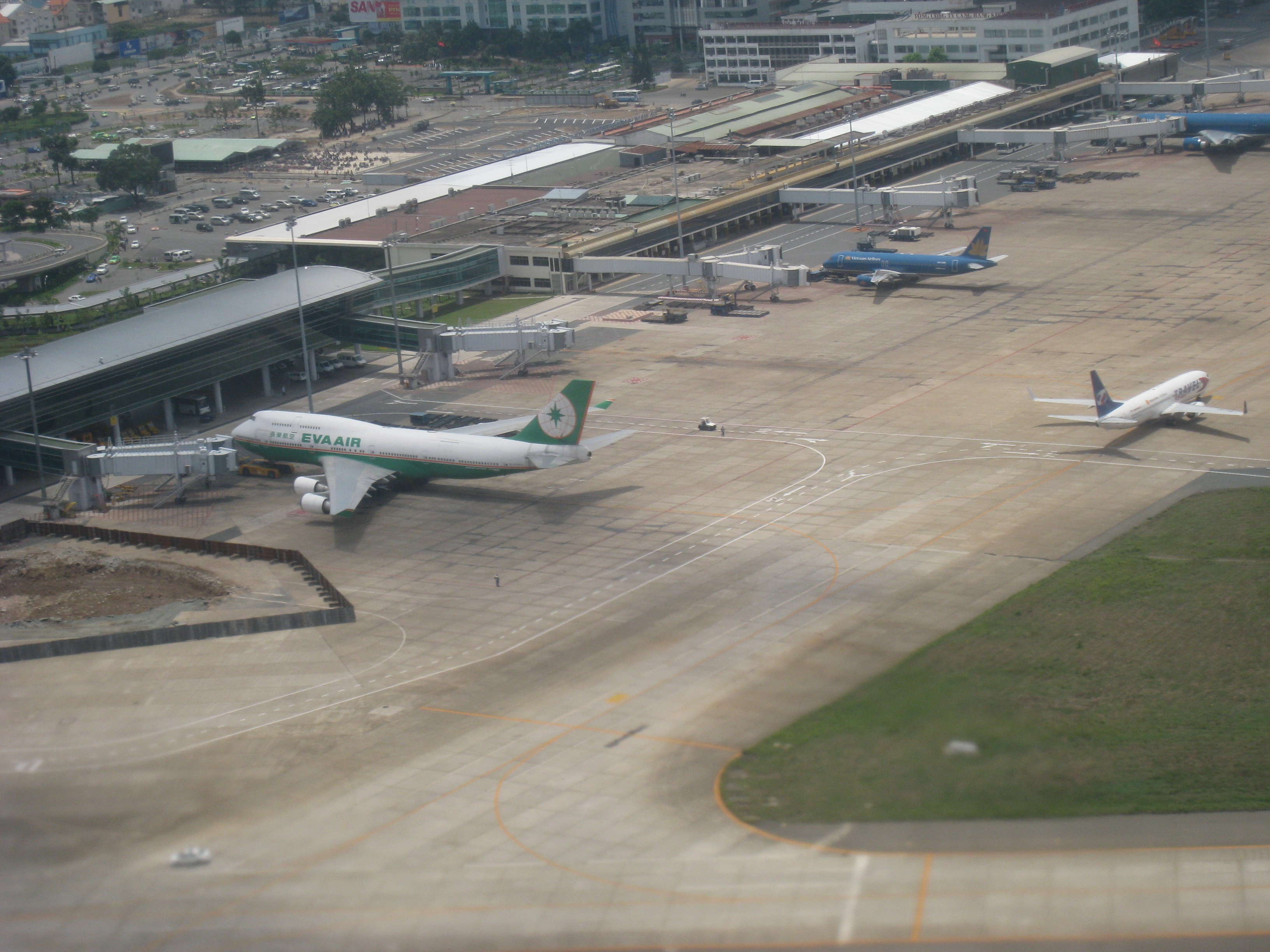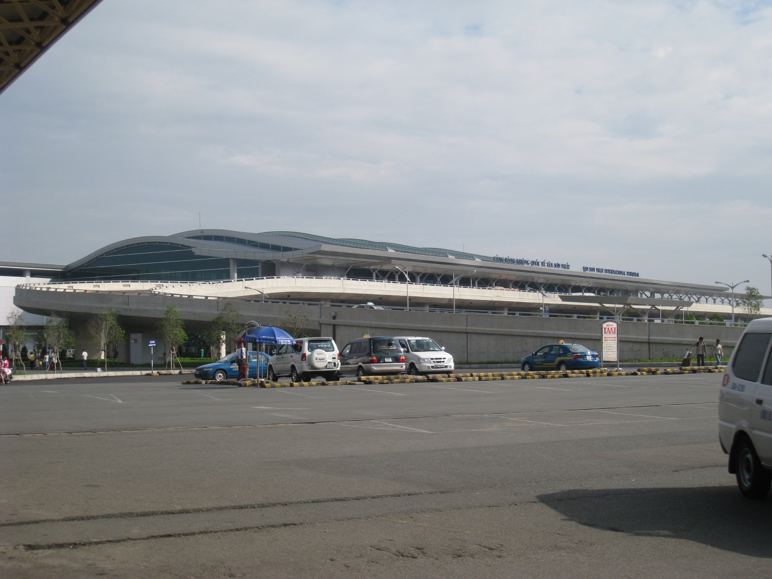 Tan Son Nhat International Airport (IATA: SGN, ICAO: VVTS) (Vietnamese: Sân bay Quốc tế Tân Sơn Nhất) is Vietnam's largest international airport in terms of area (800 ha/1,977 acres compared with 650 ha/1,606 acres of Hanoi's Noi Bai International Airport and Da Nang's Da Nang International Airport). It has a handling capacity of 15-17 million passengers per year, compared with the capacity of Hanoi - Noi Bai airport of 8 million passengers and Da Nang's 2 million passengers. It is also the largest airport of Vietnam in terms of passengers handled (with an estimated number of over 12.5 million passengers per year in 2009, accounting for more than half of Vietnam's air passenger traffic), serving Ho Chi Minh City as well as Dong Nam Bo in southern Vietnam. Its IATA code SGN was derived from the city's former name of Saigon. HistoryTan Son Nhat International Airport has its origins in the early 1930s, when the French colonial government constructed a small airport with unpaved runways, known as Tân Sơn Nhất Airfield near the village of Tan Son Nhat. By mid-1956, with U.S. aid, a 7,200-foot (2,190 m) runway had been built and the airfield near Saigon became known as South Vietnam's principal international gateway. During the Vietnam War (or Second Indochina War), Tan Son Nhut Air Base (then using the alternative spelling Tân Sơn Nhứt) was an important facility for both the U.S. Air Force and the (VNAF). Between 1968 and 1974, Tan Son Nhut Airport was one of the busiest military airbases in the world. During the last days of South Vietnam, Pan Am schedules from 1973 showed Boeing 747 service was being operated four times a week to San Francisco via Guam and Manila . Continental Airlines operated up to 30 Boeing 707 military charters per week to and from Tan Son Nhut Airport during the 1968-74 period. On 9 December 2004, United Airlines became the first U.S. airline to fly to Vietnam since Pan Am's last flight during the Fall of Saigon in April 1975. UA 869 (operated by a Boeing 747-400) landed at Ho Chi Minh City, the terminus of the flight that ran from San Francisco via Hong Kong. On 29 October 2006, this service was switched from San Francisco to Los Angeles with a stop in Hong Kong, operating as UA 867 (also using a Boeing 747-400). In 2009, the service UA 869 has resumed once again from San Francisco via Hong Kong International. In 2006, this airport at Ho Chi Minh (HCM) City served approximately 8.5 million passengers (compared with 7 million in 2005) with 64.000 aircraft movements . HCM - Tan Son Nhat Airport has recently accounted for nearly two thirds of the arrivals and departures at Vietnam's international gateway airports.. Due to increasing demand (about 15%-20% per annum), this airport has been continuously expanded by the Southern Airports Corporation. Tan Son Nhat International Airport served 13 million passengers in 2008 compared to 11 million in 2007. According to the new expansion plan announced by the Vietnamese government, the airport will be enlarged to provide facilities and space for around 70 aircraft to land by 2015, and to handle 23.5 million passengers and 600,000 tonnes of cargo per annum. New international terminalA new international terminal funded by Japanese ODA and constructed by a consortium of four Japanese contractors (KTOM, abbreviation of 4 contractors's names: Kajima - Taisei - Obayashi - Maeda), opened in September 2007 with a capacity for 8-10 million passengers a year, thus giving the airport a total annual capacity of 15-17 million passengers. The old terminal is now used for domestic flights only. After 2015, when Long Thanh International Airport is completed, Tan Son Nhat will serve domestic passengers only. The international terminal is open 24 hours a day. FacilitiesFollowing the opening of its new international terminal in September 2007, HCM - Tan Son Nhat has two major terminal buildings with separate sections for international and domestic flights. Four jetways were added in the late 1990s prior to which aircraft had to use remote parking and passengers were transferred to/from the terminal by shuttle buses. The capacity of the new terminal, once fully completed, will be 8 million passengers per annum. After 2015, when Long Thanh International Airport is completed, Tan Son Nhat will serve domestic passengers only. The Prime Minister of Vietnam by Decision 1646/TTg-NN has approved the addition of 30 hectares (74 acres) of adjacent area to extend the apron and to build a cargo terminal due to the rapid increase of passenger (which will reach to 11 million in 2007 and is expected to reach 17 million in 2010, compared to 7 million and 8.5 million in 2005 and 2006 respectively) and cargo volume at this airport Arrivals and Departures are split across two floors. Terminals, airlines and destinationsDomestic flights operate from Terminal 1, whilst international flights use Terminal 2. Passenger